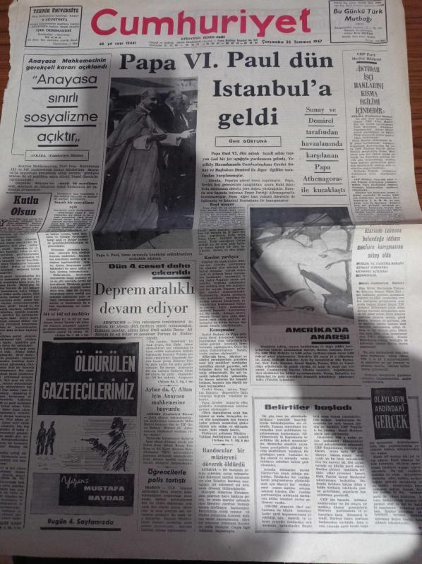 Cumhuriyet Gazetesi - 26 Temmuz 1967 - Kurucusu Yunus Nadi - Albay Nahit Saçlıoğlu - Erdal Atabek - Papa 6. Paul Dün İstanbul'a Geldi - Anayasa Sınırlı Sosyalizme Açıktır - Amerika'da Anarşi - Nadir Nadi - Adapazarı Depremi - CHP Meclisi Bildirisi - Mehmet Ali Aybar'da Çetin Altan İçin Anayasa Mahkemesine Başvurdu adlı eser Türkçe dilindedir.