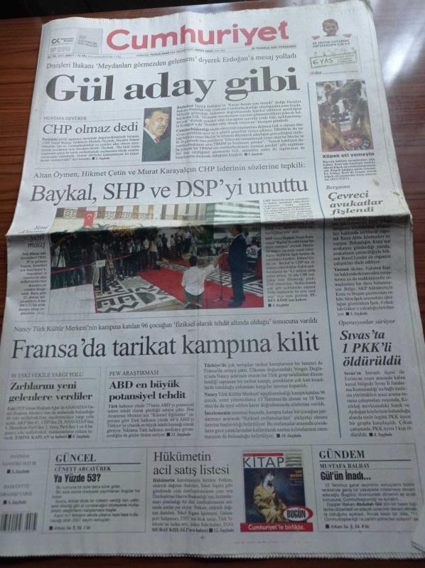 Cumhuriyet Gazetesi - 26 Temmuz 2007 - Herkes Gider Hakan Şükür Kalır - Yasin Çakmak Fenerbahçe'yi İstiyorum - Kapadokya Turizmi - Osmanlı Sanatı Japonya'da - Abdullah Gül Cumhurbaşkanı Adayı Gibi - Köpek Eti Yemeyin - Deniz Baykal SHP Ve DSP'yi Unuttu - Fransa'da Tarikat Kampına Kilit - Çevreci Avukatlar Fişlendi adlı eser Türkçe dilindedir.