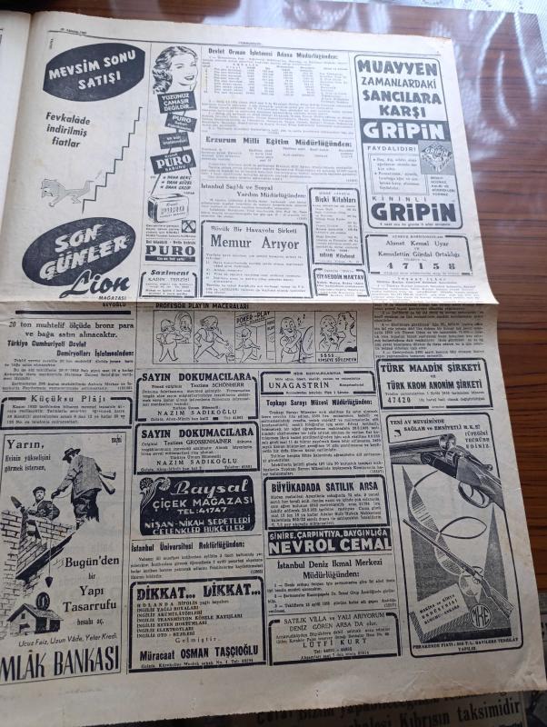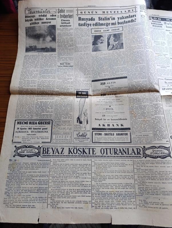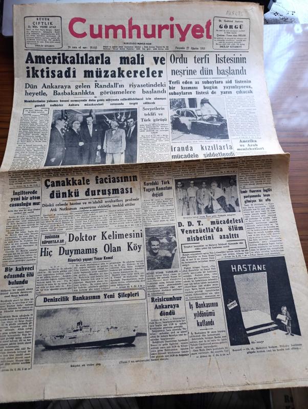 Cumhuriyet Gazetesi - 27 Ağustos 1953 - Amerikalılarla Mali Ve İktisadi Müzakereler - Yeni Amerikan Ankara Büyükelçisi Avra M. Warren Şerefine Resmi Kabul Fotoğraf - Çanakkale Faciasının Dünkü Duruşması - Doğudan Röportajlar Röportajı Yapan Yaşar Kemal Yazı Dizisi - D.D.T. Mücadelesi Venezuela'da Ölüm Nisbetini Azalttı - İran'da Kızıllarla Mücadele Şiddetlendi - Türkiye İş Bankasının Yıldönümü Kutlandı - Beyaz Köşkte Oturanlar Yazan Rikkat Köknar Yazı Dizisi - Rusya'da Stalin'in Yakınları Tasfiye Edilmeye Mi Başlandı Yazan Ömer Sami Coşar - Zeynep Kamil Doğum Evinin Temeli Dün Atıldı - Şehir Meclisinin Fevkalade Toplantısı Yazan Burhan Felek - Ses Sanatkarı Necmi Rıza Ahıskan İle Bir Mülakat Röportajı Yapan Şahap Balcıoğlu - Ankara İstanbul Bisiklet Yarışı - Galatasaray Yarın İsrail'e Gidecek - Fenerbahçe Ve Beşiktaş Ankara'ya Gidecek - İstanbul Enternasyonal Tenis Maçları - Günah Yolu Filmi Lüks Sinemasında - Mahkumlar Kervanı Filmi Lale Ve Ar Sinemasında adlı eser, Kitap > Süreli Yayınlar > Gazeteler > Türkiye > Genel > Günlük kategorisinde İkinci El olarak satıştadır.
