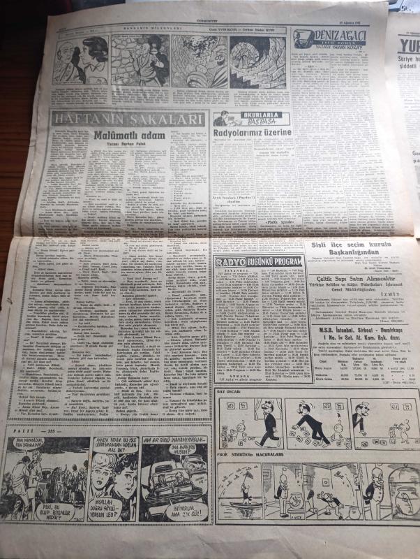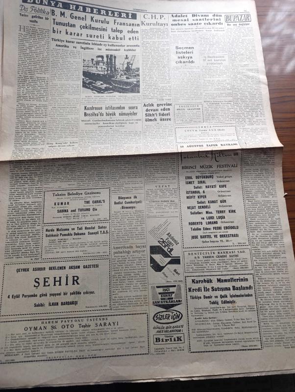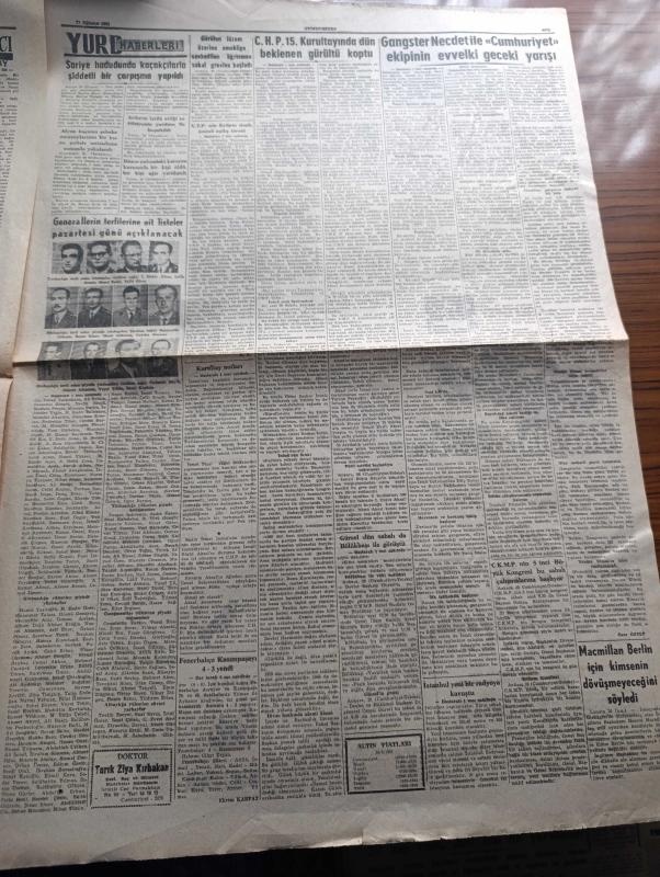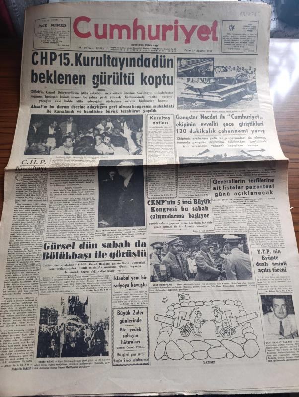 Cumhuriyet Gazetesi - 27 Ağustos 1961 - CHP kurultayı Yazan Nadir Nadi Başmakale - CHP 15. Kurultayında dün beklenen gürültü koptu - kurultayın dünkü toplantısında birbirlerine giren delegeler fotoğraf - gangster Necdet ile Cumhuriyet ekibinin evvelki gece giriştikleri 120 dakikalık cehennem yarışı fotoğraf - Cemal Gürsel dün sabah da Osman Bölükbaşı ile görüştü - cumhuriyetçi köylü millet partisinin 5. Büyük Kongresi bu sabah çalışmalarına başlıyor - generallerin terfilerine ait listeler pazartesi günü açıklanacak - Yeni Türkiye Partisi'nin Eyüp'te dualı aminli açılış töreni - İstanbul yeni bir radyoya kavuştu - Şişli Yenikapı Troleybüs hattı - her şey değişiyor yazan Yaşar Kemal - Deniz Ağacı yazan Yaman Koray Yazı Dizisi - haftanın şakaları yazan Burhan Felek - Fenerbahçe 4 Kasımpaşa 3 - Milli Lig Zorlu başladı - İstanbulspor ile Karagümrük golsüz berabere kaldı - 1961 talebe oyunları - Birinci müzik festivali Erol Büyükburç İstanbul Hilton'da - Türkiye İş Bankası yıldönümü, Yunus Nadi tarafından kaleme alınmıştır. Cumhuriyet Gazetesi - 27 Ağustos 1961 - CHP kurultayı Yazan Nadir Nadi Başmakale - CHP 15. Kurultayında dün beklenen gürültü koptu - kurultayın dünkü toplantısında birbirlerine giren delegeler fotoğraf - gangster Necdet ile Cumhuriyet ekibinin evvelki gece giriştikleri 120 dakikalık cehennem yarışı fotoğraf - Cemal Gürsel dün sabah da Osman Bölükbaşı ile görüştü - cumhuriyetçi köylü millet partisinin 5. Büyük Kongresi bu sabah çalışmalarına başlıyor - generallerin terfilerine ait listeler pazartesi günü açıklanacak - Yeni Türkiye Partisi'nin Eyüp'te dualı aminli açılış töreni - İstanbul yeni bir radyoya kavuştu - Şişli Yenikapı Troleybüs hattı - her şey değişiyor yazan Yaşar Kemal - Deniz Ağacı yazan Yaman Koray Yazı Dizisi - haftanın şakaları yazan Burhan Felek - Fenerbahçe 4 Kasımpaşa 3 - Milli Lig Zorlu başladı - İstanbulspor ile Karagümrük golsüz berabere kaldı - 1961 talebe oyunları - Birinci müzik festivali Erol Büyükburç İstanbul Hilton'da - Türkiye İş Bankası yıldönümü adlı eser Türkçe dilindedir.