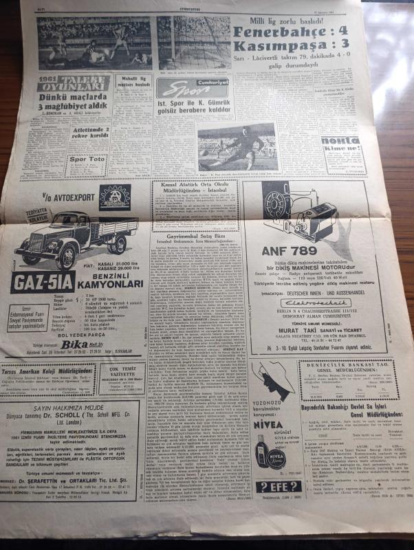 Cumhuriyet Gazetesi - 27 Ağustos 1961 - CHP kurultayı Yazan Nadir Nadi Başmakale - CHP 15. Kurultayında dün beklenen gürültü koptu - kurultayın dünkü toplantısında birbirlerine giren delegeler fotoğraf - gangster Necdet ile Cumhuriyet ekibinin evvelki gece giriştikleri 120 dakikalık cehennem yarışı fotoğraf - Cemal Gürsel dün sabah da Osman Bölükbaşı ile görüştü - cumhuriyetçi köylü millet partisinin 5. Büyük Kongresi bu sabah çalışmalarına başlıyor - generallerin terfilerine ait listeler pazartesi günü açıklanacak - Yeni Türkiye Partisi'nin Eyüp'te dualı aminli açılış töreni - İstanbul yeni bir radyoya kavuştu - Şişli Yenikapı Troleybüs hattı - her şey değişiyor yazan Yaşar Kemal - Deniz Ağacı yazan Yaman Koray Yazı Dizisi - haftanın şakaları yazan Burhan Felek - Fenerbahçe 4 Kasımpaşa 3 - Milli Lig Zorlu başladı - İstanbulspor ile Karagümrük golsüz berabere kaldı - 1961 talebe oyunları - Birinci müzik festivali Erol Büyükburç İstanbul Hilton'da - Türkiye İş Bankası yıldönümü adlı eser, Kitap > Süreli Yayınlar > Gazeteler > Türkiye > Genel > Günlük kategorisinde İkinci El olarak satıştadır.