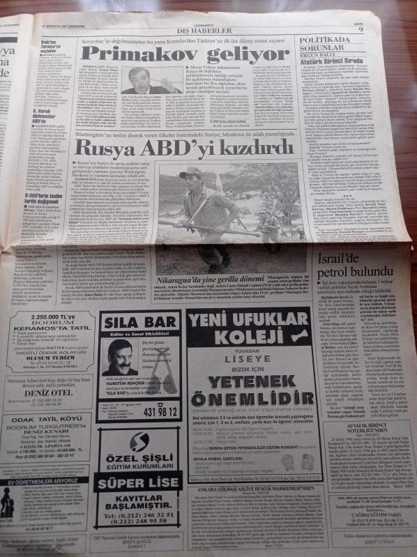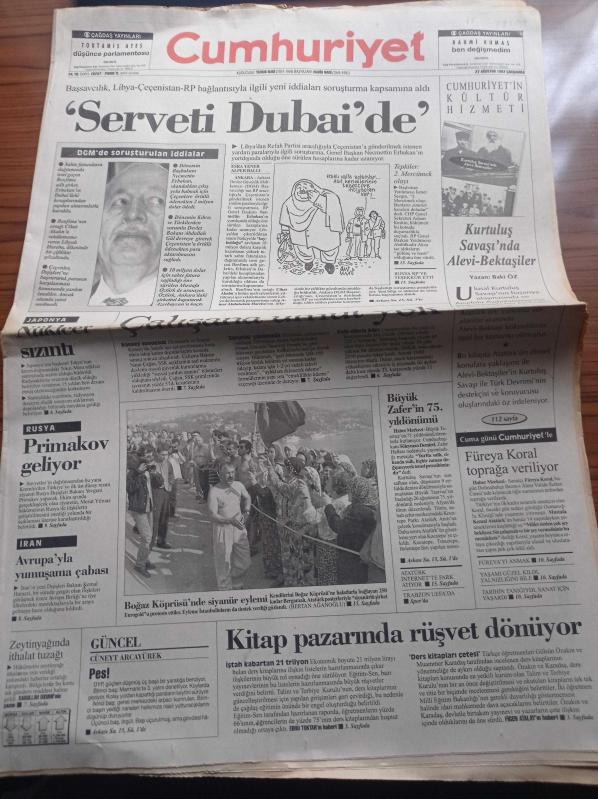 Cumhuriyet Gazetesi - 27 Ağustos 1997 - Galatasaray Beşiktaş Şampiyonlar Ligi'ne Doğru - Hüsrev İsfendiyaroğlu Dünya Gitar Festivali'nde Türkiye'yi Temsil Edecek - Necmettin Erbakan'ın Yurtdışında Olduğu Öne Sürülen Hesapları İçin Soruşturma - Devlet Güvenlik Mahkeme'sinde Soruşturulan İddialar- Bergamalılar Boğaz Köprüsü'nde Siyanür Eylemi Yaptı - Serveti Dubai 'de- Büyük Taarruz'un 75. Yıldönümü adlı eser Türkçe dilindedir.