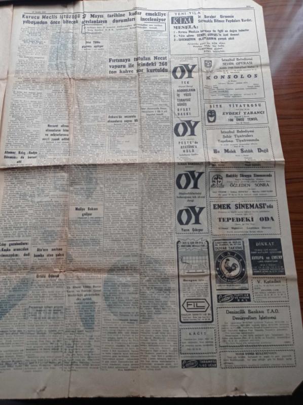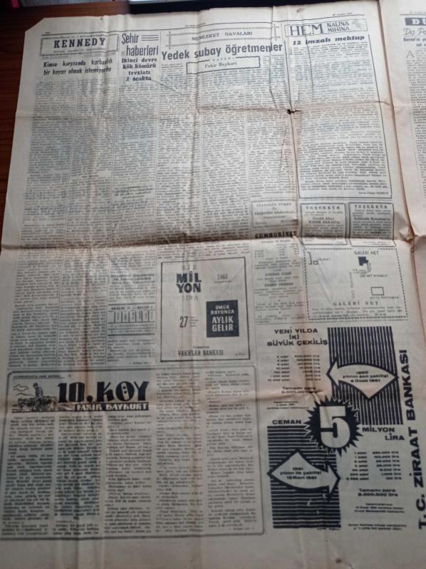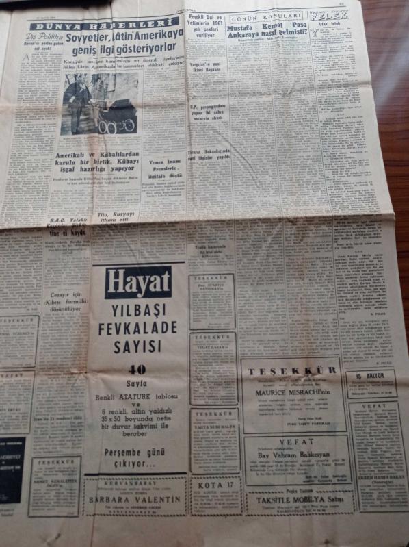 Cumhuriyet Gazetesi - 27 Aralık 1960 - İsmet Uluğ Fenerbahçe Takımında Gençlere Yer Verilecek - Galatasaray da Etilerde Daimi Kamp Açtı - Haftanın Ası Ahmet Özacar - Ankara'da Nezarete Alınanların Sayısı 65 Büyük Çoğunluğu Demokrat Partili - 147'ler Bu Hafta İçinde Üniversiteye Dönüyorlar - Altemur Kılıç Radyo Davasında Beraat Etti - Ata'nın Anıtına Bomba Atan Şahıs Yakalandı - Cemal Gürsel Kurucu Meclis'e Behçet Kemal Çağlar'ı Da Seçti - Yeni Maliye Bakanı Kemal Kurdaş - Milli Birlik Komitesi adlı eser Türkçe dilindedir.