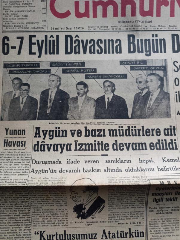 Cumhuriyet Gazetesi - 27 Ekim 1960 - Yunan havası yazan Nadir Nadi Başmakale - 6 7 Eylül davasına bugün devam edilecek - yolsuzluk davasının sanıkları Demir Turgut Abdullah Takdaş Sadettin Özil Kemal Kutlu Numan Sinanoğlu Cevat Bil Saffet Sezen duruşma sırasında fotoğraf - Ali Ulvi'nin fırçasından Kemal Aygün Fotoğraf - Kemal Aygün ve bazı müdürlere ait davaya İzmit'te devam edildi - milli birlik komitesi af kanununu dün gece kabul etti - 1960 Nobel edebiyat mükafatını kazanan şair Saint John Perse fotoğraf - Devlet Başkanı Cemal Gürsel kurtuluşumuz Atatürk'ün izinden gitmeye bağlıdır - yassıada mektebi yazan Hamdi Varoğlu - Kraliçe Elizabeth ölüm tehlikesi atlattı - iş bölümü yazan Burhan Felek - tiyatro Şair Ruhu ve Kanaviçe yazan Lütfi Ay - Şehir Tiyatrosu dram kısmında Eyyup üzerine oyun Kral Lear Ve Madam Butterfly - B milli futbol takımı dün akşam ilan edildi - Kıbrıs'ta Doğan Türk Birliği takımı favori fotoğraf - Necdet Erdem Feriköy'e antrenör oldu - Halimi boks şampiyonu oldu, Yunus Nadi tarafından kaleme alınmıştır. Cumhuriyet Gazetesi - 27 Ekim 1960 - Yunan havası yazan Nadir Nadi Başmakale - 6 7 Eylül davasına bugün devam edilecek - yolsuzluk davasının sanıkları Demir Turgut Abdullah Takdaş Sadettin Özil Kemal Kutlu Numan Sinanoğlu Cevat Bil Saffet Sezen duruşma sırasında fotoğraf - Ali Ulvi'nin fırçasından Kemal Aygün Fotoğraf - Kemal Aygün ve bazı müdürlere ait davaya İzmit'te devam edildi - milli birlik komitesi af kanununu dün gece kabul etti - 1960 Nobel edebiyat mükafatını kazanan şair Saint John Perse fotoğraf - Devlet Başkanı Cemal Gürsel kurtuluşumuz Atatürk'ün izinden gitmeye bağlıdır - yassıada mektebi yazan Hamdi Varoğlu - Kraliçe Elizabeth ölüm tehlikesi atlattı - iş bölümü yazan Burhan Felek - tiyatro Şair Ruhu ve Kanaviçe yazan Lütfi Ay - Şehir Tiyatrosu dram kısmında Eyyup üzerine oyun Kral Lear Ve Madam Butterfly - B milli futbol takımı dün akşam ilan edildi - Kıbrıs'ta Doğan Türk Birliği takımı favori fotoğraf - Necdet Erdem Feriköy'e antrenör oldu - Halimi boks şampiyonu oldu adlı eser Türkçe dilindedir.