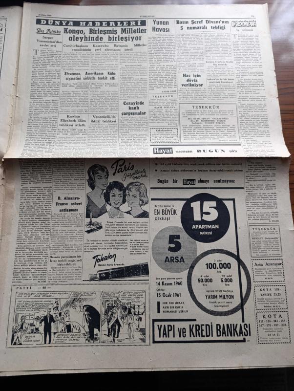 Cumhuriyet Gazetesi - 27 Ekim 1960 - Yunan havası yazan Nadir Nadi Başmakale - 6 7 Eylül davasına bugün devam edilecek - yolsuzluk davasının sanıkları Demir Turgut Abdullah Takdaş Sadettin Özil Kemal Kutlu Numan Sinanoğlu Cevat Bil Saffet Sezen duruşma sırasında fotoğraf - Ali Ulvi'nin fırçasından Kemal Aygün Fotoğraf - Kemal Aygün ve bazı müdürlere ait davaya İzmit'te devam edildi - milli birlik komitesi af kanununu dün gece kabul etti - 1960 Nobel edebiyat mükafatını kazanan şair Saint John Perse fotoğraf - Devlet Başkanı Cemal Gürsel kurtuluşumuz Atatürk'ün izinden gitmeye bağlıdır - yassıada mektebi yazan Hamdi Varoğlu - Kraliçe Elizabeth ölüm tehlikesi atlattı - iş bölümü yazan Burhan Felek - tiyatro Şair Ruhu ve Kanaviçe yazan Lütfi Ay - Şehir Tiyatrosu dram kısmında Eyyup üzerine oyun Kral Lear Ve Madam Butterfly - B milli futbol takımı dün akşam ilan edildi - Kıbrıs'ta Doğan Türk Birliği takımı favori fotoğraf - Necdet Erdem Feriköy'e antrenör oldu - Halimi boks şampiyonu oldu adlı eser, Kitap > Süreli Yayınlar > Gazeteler > Türkiye > Genel > Günlük kategorisinde İkinci El olarak satıştadır.