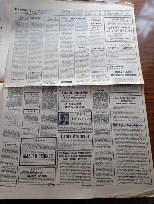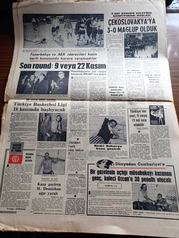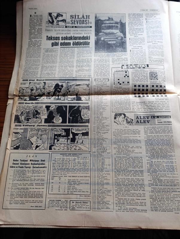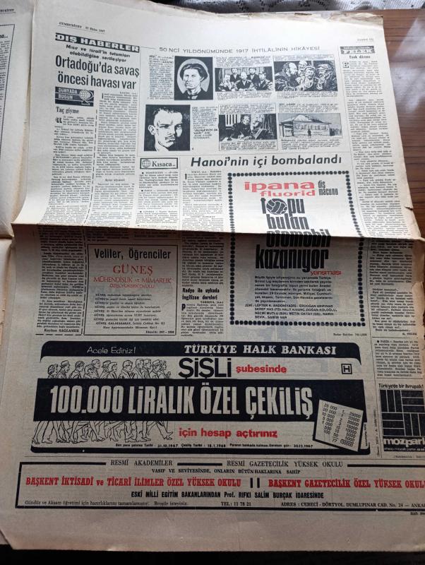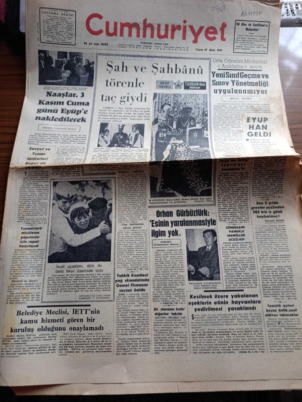 Cumhuriyet Gazetesi - 27 Ekim 1967 - Adnan Menderes Hasan Polatkan Fatin Rüştü Zorlu'nun naaşları 3 Kasım Cuma günü Eyüp'e nakledilecek - Şah ve Şahbanu törenle taç giydi fotoğraf - yeni sınıf geçme ve sınav yönetmeliği uygulanamıyor - son 5 yılda grevler yüzünden 983 bin iş günü kaybolmuş - Bülent Ecevit şimdiye kadar özel teşebbüs doğuda hangi fabrikayı kurmuştur dedi - bir dananın kalbi diğerine takıldı - Eyüp Sultandan Johnsona yazan İlhan Selçuk - 50. Yıldönümünde 1917 ihtilalinin hikayesi - eşek davası yazan Burhan Felek - İpana diş macunu - Mısır ve İsrail'in tutumları sertleşiyor Ortadoğu'da Savaş öncesi havası var - silah sevdası Yazı ve fotoğraflar Sait A. Terzioğlu - tütün kumarı yazan Hikmet Çetinkaya - elhamra İstanbul Tiyatrosu beni kimse durduramaz - Fenerbahçe ve AEK idarecileri maç tarihi konusunda kesin karara varamadılar 9 veya 22 Kasım - Türkiye Basketbol ligi 18 Kasım'da başlayacak - 7. Avrupa voleybol şampiyonası başladı - Bisikletçi Bedri Sakarya kaza geçirdi adlı eser, Kitap > Süreli Yayınlar > Gazeteler > Türkiye > Genel > Günlük kategorisinde İkinci El olarak satıştadır.