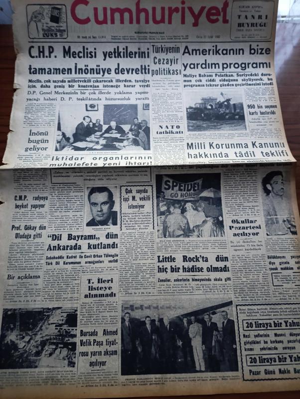 Cumhuriyet Gazetesi - 27 Eylül 1957 - Cumhuriyet Halk Partisi Yetkilerini Tamamen İsmet İnönü'ye Devretti - Türkiye'nin Cezayir Politikası - Amerika'nın Bize Yardım Programı - Cumhuriyetçi Millet Partisi Radyoya Boykot Yapıyor - Dil Bayramı Dün Ankara'da Kutlandı - Amerika'nın Bize Yardım Programı - 950 Bin Seçmen Kartı Bastırıldı - Osman Bölükbaşını Yazıyor Diye Gazete Satan Çocuk Mahkum Oldu - İblisin Kızı Yazan Guy Des Cars Yazı Dizisi - Seçimlerden Sonra Almanya Yazan Feyyaz Tokar - Profesör Nümbüs'ün Maceraları Çizgi Roman - Maliye Bakanı Hasan Polatkan Makarios'u İtham Etti - İhtiyarlar Asya Gribi Olmuyor - Burhan Felek Köşe Yazısı - Yurtta Seçim Mücadelesi İntibaları - Bulmaca - Ankara İstanbul Radyosu Programı - Batı Trakya'da da Fenerbahçe Kuruldu - Boğazı Geçme Yüzme Yarışını Selma Hassan Ve Yılmaz Özüak Kazandılar - Beşiktaş Beyoğluspor Bugün Karşılaşıyor, Yunus Nadi tarafından kaleme alınmıştır. Cumhuriyet Gazetesi - 27 Eylül 1957 - Cumhuriyet Halk Partisi Yetkilerini Tamamen İsmet İnönü'ye Devretti - Türkiye'nin Cezayir Politikası - Amerika'nın Bize Yardım Programı - Cumhuriyetçi Millet Partisi Radyoya Boykot Yapıyor - Dil Bayramı Dün Ankara'da Kutlandı - Amerika'nın Bize Yardım Programı - 950 Bin Seçmen Kartı Bastırıldı - Osman Bölükbaşını Yazıyor Diye Gazete Satan Çocuk Mahkum Oldu - İblisin Kızı Yazan Guy Des Cars Yazı Dizisi - Seçimlerden Sonra Almanya Yazan Feyyaz Tokar - Profesör Nümbüs'ün Maceraları Çizgi Roman - Maliye Bakanı Hasan Polatkan Makarios'u İtham Etti - İhtiyarlar Asya Gribi Olmuyor - Burhan Felek Köşe Yazısı - Yurtta Seçim Mücadelesi İntibaları - Bulmaca - Ankara İstanbul Radyosu Programı - Batı Trakya'da da Fenerbahçe Kuruldu - Boğazı Geçme Yüzme Yarışını Selma Hassan Ve Yılmaz Özüak Kazandılar - Beşiktaş Beyoğluspor Bugün Karşılaşıyor adlı eser Türkçe dilindedir.