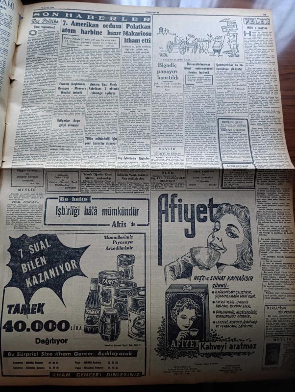 Cumhuriyet Gazetesi - 27 Eylül 1957 - Cumhuriyet Halk Partisi Yetkilerini Tamamen İsmet İnönü'ye Devretti - Türkiye'nin Cezayir Politikası - Amerika'nın Bize Yardım Programı - Cumhuriyetçi Millet Partisi Radyoya Boykot Yapıyor - Dil Bayramı Dün Ankara'da Kutlandı - Amerika'nın Bize Yardım Programı - 950 Bin Seçmen Kartı Bastırıldı - Osman Bölükbaşını Yazıyor Diye Gazete Satan Çocuk Mahkum Oldu - İblisin Kızı Yazan Guy Des Cars Yazı Dizisi - Seçimlerden Sonra Almanya Yazan Feyyaz Tokar - Profesör Nümbüs'ün Maceraları Çizgi Roman - Maliye Bakanı Hasan Polatkan Makarios'u İtham Etti - İhtiyarlar Asya Gribi Olmuyor - Burhan Felek Köşe Yazısı - Yurtta Seçim Mücadelesi İntibaları - Bulmaca - Ankara İstanbul Radyosu Programı - Batı Trakya'da da Fenerbahçe Kuruldu - Boğazı Geçme Yüzme Yarışını Selma Hassan Ve Yılmaz Özüak Kazandılar - Beşiktaş Beyoğluspor Bugün Karşılaşıyor adlı eser, Kitap > Süreli Yayınlar > Gazeteler > Türkiye > Genel > Günlük kategorisinde İkinci El olarak satıştadır.