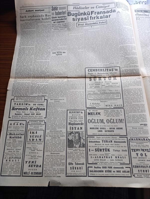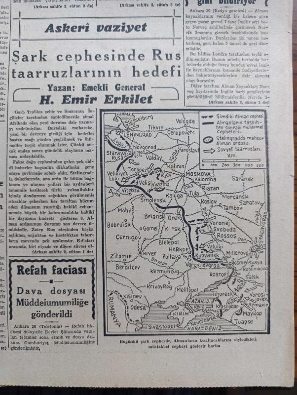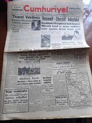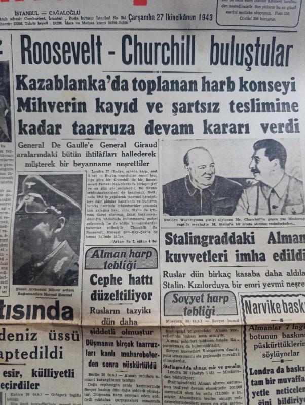 Cumhuriyet Gazetesi - 27 İkincikanun (Ocak) 1943 - hesapta yanlışlar Cumhuriyet Başmakale - Ticaret vekilimiz Doktor Behçet Uz Adana ve Mersin'de tetkikler yapıyor - Roosevelt Churchill buluştular - geçen yaz Churchill'in Moskova'ya yaptığı ziyarette Stalin'le fotoğrafı - Alman harp tebliği cephe hattı düzeltiliyor - Trablus batısında mihver'in en son deniz üssü zuara limanı zaptedildi - Varlık vergisi vermeyenler bu akşamki trenle Aşkale'ye sevk ediliyor - Askeri Vaziyet Yazan Emekli General H. Emir Erkilet Yazı Dizisi - Narvike Baskını - çiçek hastalığına uyuz tedavisi mi yapılmış - bekarlar Kulübü Çarşıkapı Azak'ta - Sürtük filmi Çemberlitaş sinemasında - Milli roman Toros Çocuğu yazan Mehmet Şevki Yazman yazı dizisi - acı bir kayıp yazar arkadaşımız Agah İzzet vefat etti - Türkiye spor ansiklopedisi cumartesi günü çıkıyor - bugünkü radyo programı - Marsilya'da 250'den fazla kişi kurşuna dizilmiş - refah faciası - Almanlar 7 İngiliz botunun baskınını püskürttüklerini söylüyorlar adlı eser, Kitap > Süreli Yayınlar > Gazeteler > Türkiye > Genel > Günlük kategorisinde İkinci El olarak satıştadır.