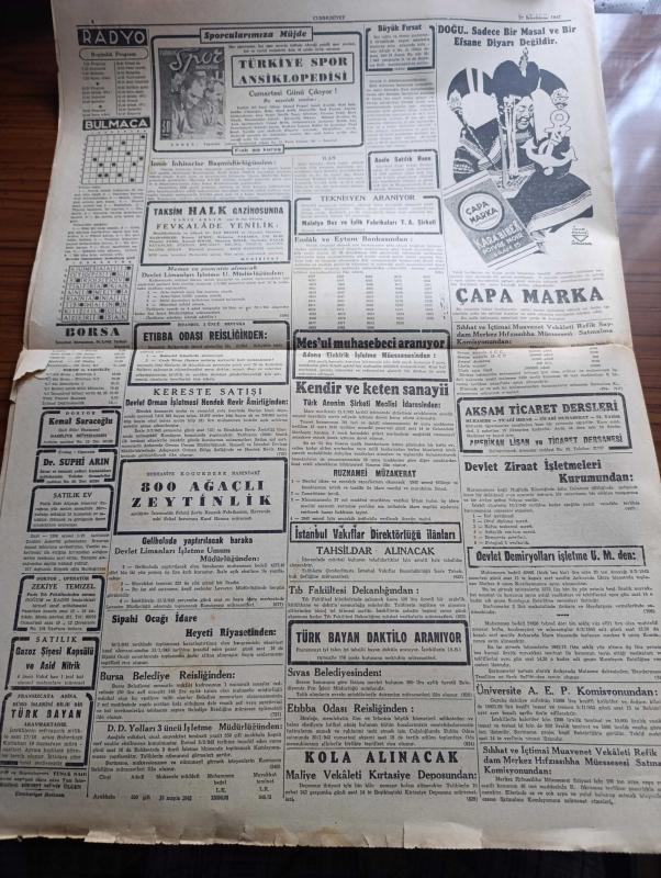 Sayfa Boyutu : 42*58 cm Sayfa Sayısı: 4 Cumhuriyet Gazetesi Yıpranma, sararmalar, kupon kesiği ve yırtılmalar zamana bağlı olarak görülebilir Bilgilendirme : Tam takım gazetedir