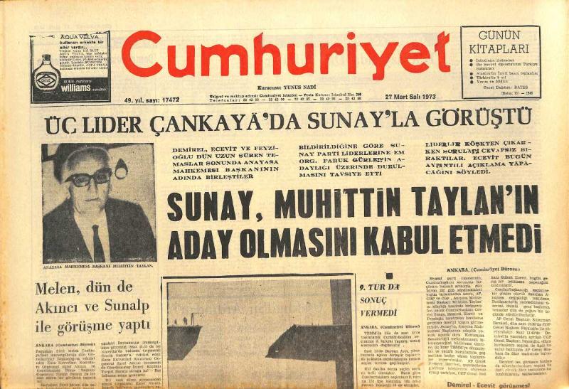Cumhuriyet Gazetesi 27 Mart 1973 - Cevdet Sunay, Muhittin Taylan'ın Aday Olmasını Kabul Etmedi! - Boğaz Köprüsüne Son Tabliye Törenle Kondu GZ142604, en son 19 gün önce güncellenmiştir.