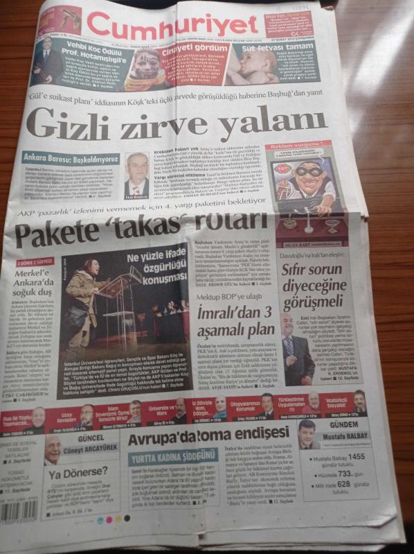 Cumhuriyet Gazetesi - 27 Şubat 2013 - Abdullah Gül'e Suikast Planı İddiasının Köşk'teki Üçlü Zirvede Görüşüldüğü Haberine İlker Başbuğ'dan Yanıt - Ankara Barosu Başkaldırıyoruz - AKP 4. Yargı Paketini Bekletiyor - Ahmet Davutoğlu'na Irak'tan Eleştiri - İmralı'dan 3. Aşamalı Plan - Angela Merkel'e Ankara'da Soğuk Duş - Vehbi Koç Ödülü Gökhan Hotamışlıgil'e adlı eser, Kitap > Süreli Yayınlar > Gazeteler kategorisinde İkinci El olarak satıştadır.