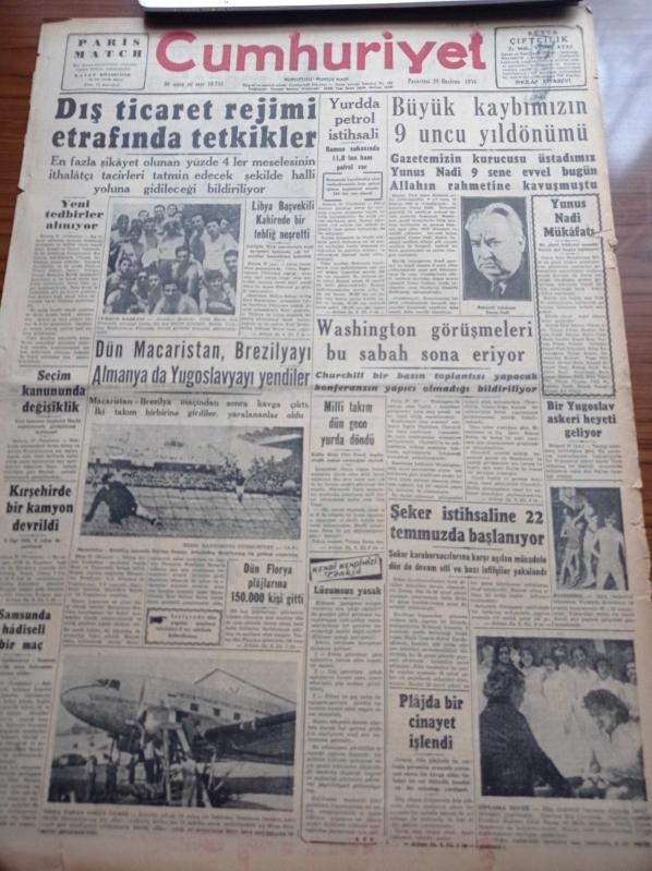 Cumhuriyet Gazetesi - 28 Haziran 1954 - Dış Ticaret Rejimi Etrafında Tetkikler - Büyük Kaybımız Yunus Nadi'nin 9. Yıldönümü - Dün Macaristan Brezilyayı Almanya Da Yugoslavya'yı Yendiler - Seçim Kanununda Değişiklik - Dün Florya Plajlarına 150.000 Kişi Gitti - Şeker İstihsaline 22 Temmuzda Başlanıyor - Bedri Rahmi Eyüboğlu Pazartesi Konuşmaları - Muhtemel Atom Harbine Karşı Tedbirler - Selanik Bankası - İstanbul Camileri Yazı Dizisi - Gül Kupası Atletizm Müsabakaları - Resimli Romanımız Ecel Gemisi - Bu Günün En Meşhur Kadın Casusları Yazı Dizisi - Macar Futbol Yıldızı Brezilyalı Bauer'i Şişe İle Yaraladı - Güneş Tutulması Filme Alınacak - Sanatçı Nevin Aypar Puro Tuvalet Sabunları Kullanıyorum Diyor - Pond's Kremleri - Pan American - Turyağ Nebati Mutbak Yağı - Vita Mutbak Margarini - Buffalo Kamyon Ve Otomobil Lastikleri - Fazıl Çil İlacı, Yunus Nadi tarafından kaleme alınmıştır. Cumhuriyet Gazetesi - 28 Haziran 1954 - Dış Ticaret Rejimi Etrafında Tetkikler - Büyük Kaybımız Yunus Nadi'nin 9. Yıldönümü - Dün Macaristan Brezilyayı Almanya Da Yugoslavya'yı Yendiler - Seçim Kanununda Değişiklik - Dün Florya Plajlarına 150.000 Kişi Gitti - Şeker İstihsaline 22 Temmuzda Başlanıyor - Bedri Rahmi Eyüboğlu Pazartesi Konuşmaları - Muhtemel Atom Harbine Karşı Tedbirler - Selanik Bankası - İstanbul Camileri Yazı Dizisi - Gül Kupası Atletizm Müsabakaları - Resimli Romanımız Ecel Gemisi - Bu Günün En Meşhur Kadın Casusları Yazı Dizisi - Macar Futbol Yıldızı Brezilyalı Bauer'i Şişe İle Yaraladı - Güneş Tutulması Filme Alınacak - Sanatçı Nevin Aypar Puro Tuvalet Sabunları Kullanıyorum Diyor - Pond's Kremleri - Pan American - Turyağ Nebati Mutbak Yağı - Vita Mutbak Margarini - Buffalo Kamyon Ve Otomobil Lastikleri - Fazıl Çil İlacı adlı eser Türkçe dilindedir.