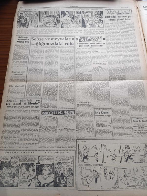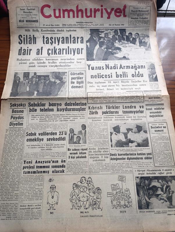 Cumhuriyet Gazetesi - 28 Haziran 1960 - Şakşakçı Basına Paydos Diyelim Yazan Nadir Nadi Köşe Yazısı - Milli Birlik Komitesinin Dünkü Toplantısı Silah Taşıyanlara Dair Af Çıkarılıyor - Cemal Gürselin Partiler İle İlgili Demeci - Sabıklar Banyo Dairelerine Bile Telefon Koydurmuşlar - Yunus Nadi Armağanı Neticesi Belli Oldu Birinci Ekrem Alptekin - Kıbrıslı Türkler Londra Ve Zürih Paktlarını Tanımıyorlar - Aydın Köylerinde İnkılap Aleyhine Beyanname Dağıtan 3 Kişi Yakalandı - Yıldızlar Mahallesinde Komiserdim Beverly Hills Yazan Clinton Anderson Yazı Dizisi - Dümensiz Gemi Yazan Rikkat Köknar Yazı Dizisi - Rockfeller Başkan Adayı Nixon'a Açıkça Cephe Aldı - Resimli Roman Başkasının Günahı Çizen Yves Sayol - Koruyucu Melekler Aşkın Gözleri Çizgi Roman - Bay Oscar Karikatür - Profesör Nimbüs'ün Maceraları - Selimiye Koca Sinan Kırkpınar Koca Yusuf Yazan Erdoğan Arıpınar - Fenerbahçe'de Boks Şubesi Kaptanı Halit Çetinkaya İstenilmiyor - Amatör Türkiye Şampiyonu Sakarya Yıldırımspor, Yunus Nadi tarafından kaleme alınmıştır. Cumhuriyet Gazetesi - 28 Haziran 1960 - Şakşakçı Basına Paydos Diyelim Yazan Nadir Nadi Köşe Yazısı - Milli Birlik Komitesinin Dünkü Toplantısı Silah Taşıyanlara Dair Af Çıkarılıyor - Cemal Gürselin Partiler İle İlgili Demeci - Sabıklar Banyo Dairelerine Bile Telefon Koydurmuşlar - Yunus Nadi Armağanı Neticesi Belli Oldu Birinci Ekrem Alptekin - Kıbrıslı Türkler Londra Ve Zürih Paktlarını Tanımıyorlar - Aydın Köylerinde İnkılap Aleyhine Beyanname Dağıtan 3 Kişi Yakalandı - Yıldızlar Mahallesinde Komiserdim Beverly Hills Yazan Clinton Anderson Yazı Dizisi - Dümensiz Gemi Yazan Rikkat Köknar Yazı Dizisi - Rockfeller Başkan Adayı Nixon'a Açıkça Cephe Aldı - Resimli Roman Başkasının Günahı Çizen Yves Sayol - Koruyucu Melekler Aşkın Gözleri Çizgi Roman - Bay Oscar Karikatür - Profesör Nimbüs'ün Maceraları - Selimiye Koca Sinan Kırkpınar Koca Yusuf Yazan Erdoğan Arıpınar - Fenerbahçe'de Boks Şubesi Kaptanı Halit Çetinkaya İstenilmiyor - Amatör Türkiye Şampiyonu Sakarya Yıldırımspor adlı eser Türkçe dilindedir.