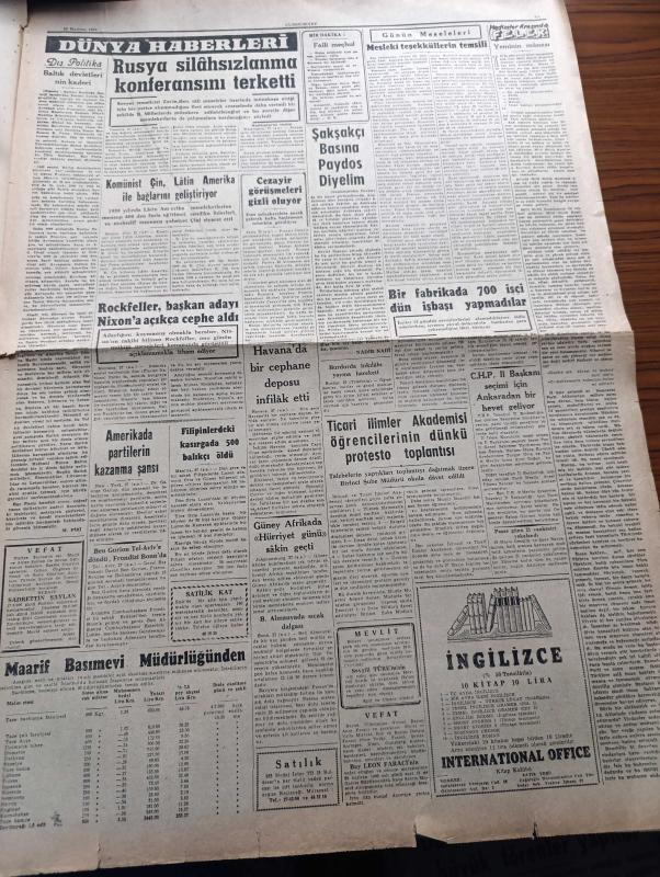 Cumhuriyet Gazetesi - 28 Haziran 1960 - Şakşakçı Basına Paydos Diyelim Yazan Nadir Nadi Köşe Yazısı - Milli Birlik Komitesinin Dünkü Toplantısı Silah Taşıyanlara Dair Af Çıkarılıyor - Cemal Gürselin Partiler İle İlgili Demeci - Sabıklar Banyo Dairelerine Bile Telefon Koydurmuşlar - Yunus Nadi Armağanı Neticesi Belli Oldu Birinci Ekrem Alptekin - Kıbrıslı Türkler Londra Ve Zürih Paktlarını Tanımıyorlar - Aydın Köylerinde İnkılap Aleyhine Beyanname Dağıtan 3 Kişi Yakalandı - Yıldızlar Mahallesinde Komiserdim Beverly Hills Yazan Clinton Anderson Yazı Dizisi - Dümensiz Gemi Yazan Rikkat Köknar Yazı Dizisi - Rockfeller Başkan Adayı Nixon'a Açıkça Cephe Aldı - Resimli Roman Başkasının Günahı Çizen Yves Sayol - Koruyucu Melekler Aşkın Gözleri Çizgi Roman - Bay Oscar Karikatür - Profesör Nimbüs'ün Maceraları - Selimiye Koca Sinan Kırkpınar Koca Yusuf Yazan Erdoğan Arıpınar - Fenerbahçe'de Boks Şubesi Kaptanı Halit Çetinkaya İstenilmiyor - Amatör Türkiye Şampiyonu Sakarya Yıldırımspor adlı eser, Kitap > Süreli Yayınlar > Gazeteler > Türkiye > Genel > Günlük kategorisinde İkinci El olarak satıştadır.