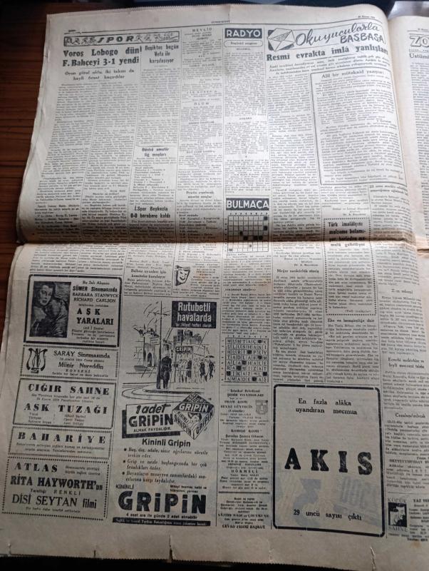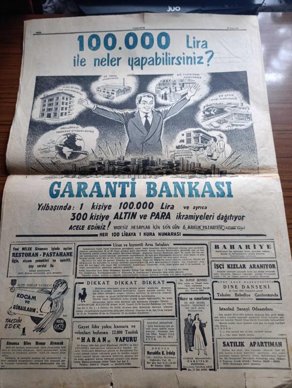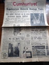 Cumhuriyet Gazetesi - 28 Kasım 1954 - Bu ders pek acı oldu yazan Nadir Nadi Başmakale - kapalıçarşıyı elektrik kontağı yaktı - Kapalıçarşı'da 3000 dükkandan 2.000'i yandı zarar 300 milyon lira - umumi sigorta yekünu 14 milyon lira - 10.000 esnaf ve 100.000 işçi işsiz kaldı - tarihi kapalıçarşı'nın dünkü acıklı manzarası fotoğraf - yanan Kapalıçarşı'da dün neler gördük - Celal Bayar İstanbul'a geliyor - kapalıçarşı'nın yanan ve yanmayan kısımlarını gösterir kroki - yangının çıktığı yorgancı dükkanı fotoğraf - Voroş Lobogo dün Fenerbahçe'yi 3-1 yendi fotoğraf - Kapalıçarşı yangını hakkında yabancı radyoların neşriyatı - Kapalıçarşı ve Tarihi yazan Haluk Yusuf Şehsuvaroğlu - Ceyhan eski kuvayi milliye mücahitlerinin başvekil Adnan Menderes'e telgrafı - Beşiktaş bugün Vefa ile karşılaşıyor - İstanbulspor Beykozla berabere kaldı - Aşk yaraları filmi Sümer sinemasında - Münir Nurettin Selçuk konseri Saray sinemasında - Zoraki Diplomat yazan Yakup Kadri Karaosmanoğlu Yazı Dizisi adlı eser, Kitap > Süreli Yayınlar > Gazeteler > Türkiye > Genel > Günlük kategorisinde İkinci El olarak satıştadır.