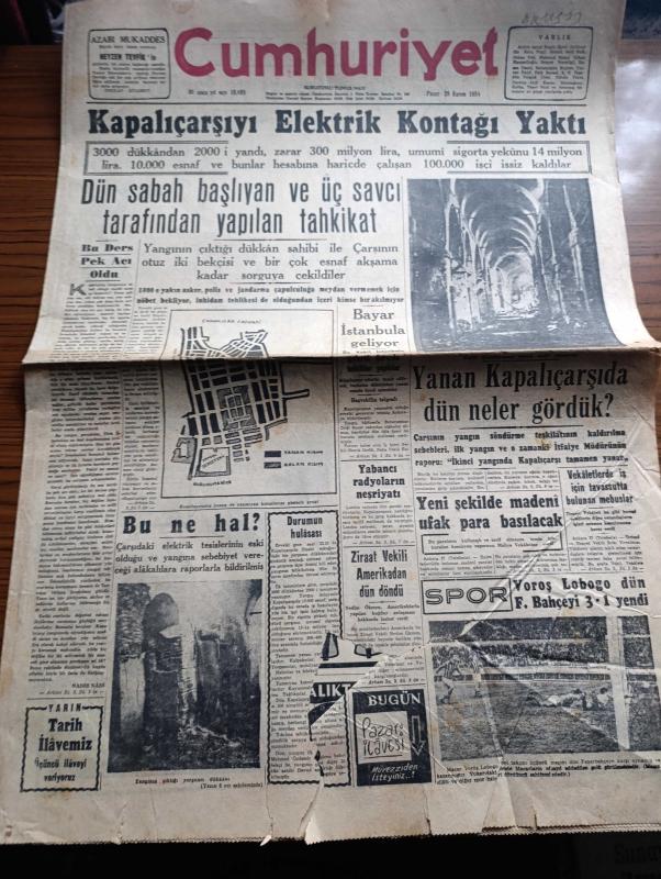 Cumhuriyet Gazetesi - 28 Kasım 1954 - Bu ders pek acı oldu yazan Nadir Nadi Başmakale - kapalıçarşıyı elektrik kontağı yaktı - Kapalıçarşı'da 3000 dükkandan 2.000'i yandı zarar 300 milyon lira - umumi sigorta yekünu 14 milyon lira - 10.000 esnaf ve 100.000 işçi işsiz kaldı - tarihi kapalıçarşı'nın dünkü acıklı manzarası fotoğraf - yanan Kapalıçarşı'da dün neler gördük - Celal Bayar İstanbul'a geliyor - kapalıçarşı'nın yanan ve yanmayan kısımlarını gösterir kroki - yangının çıktığı yorgancı dükkanı fotoğraf - Voroş Lobogo dün Fenerbahçe'yi 3-1 yendi fotoğraf - Kapalıçarşı yangını hakkında yabancı radyoların neşriyatı - Kapalıçarşı ve Tarihi yazan Haluk Yusuf Şehsuvaroğlu - Ceyhan eski kuvayi milliye mücahitlerinin başvekil Adnan Menderes'e telgrafı - Beşiktaş bugün Vefa ile karşılaşıyor - İstanbulspor Beykozla berabere kaldı - Aşk yaraları filmi Sümer sinemasında - Münir Nurettin Selçuk konseri Saray sinemasında - Zoraki Diplomat yazan Yakup Kadri Karaosmanoğlu Yazı Dizisi
