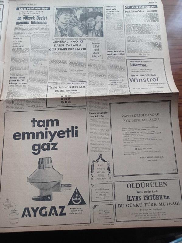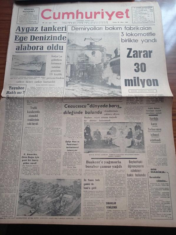 Cumhuriyet Gazetesi - 28 Mart 1969 - Kurucusu Yunus Nadi - Nadir Nadi - Adnan Menderes'in Dramı Yazı Dizisi - Şevket Süreyya Aydemir - Aygaz Tankeri Ege Denizinde Alabora Oldu - Demiryolları Bakım Fabrikaları 3 Lokomotifle Birlikte Yandı Zarar 30 Milyon - Romen Devlet Başkanı Ceaucescu Dünyada Barış Dileğinde Bulundu - Galatasaray'ın Yolu Bursa'dan Geçiyor - Masa Yenisi Milli Takımı Açıklandı adlı eser Türkçe dilindedir.