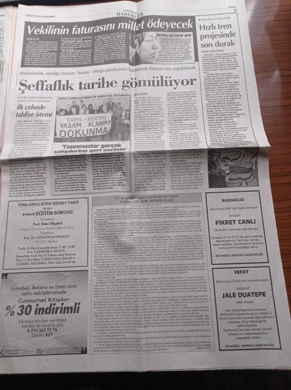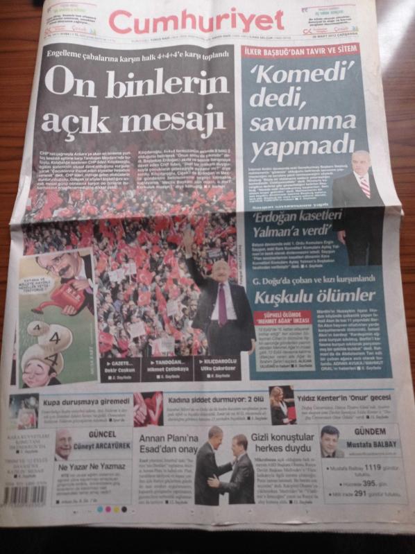 Cumhuriyet Gazetesi - 28 Mart 2012 - Sarı Melekler Ağladı Ağlattı - Galatasaray Kupaya Koşuyor - Engelleme Çabalarına Karşın Halk 4+4+4'e Karşı Toplandı - Tandoğan Meydanı - Kemal Kılıçdaroğlu - Annan Planı'na Beşar Esad'dan Onay - Yıldız Kenter'in Onur Gecesi - Recep Tayyip Erdoğan Kasetleri Dönemin Kara Kuvvetleri Komutanı Aytaç Yalman'a Verdi - İlker Başbuğ'dan Tavır Ve Sitem adlı eser Türkçe dilindedir.