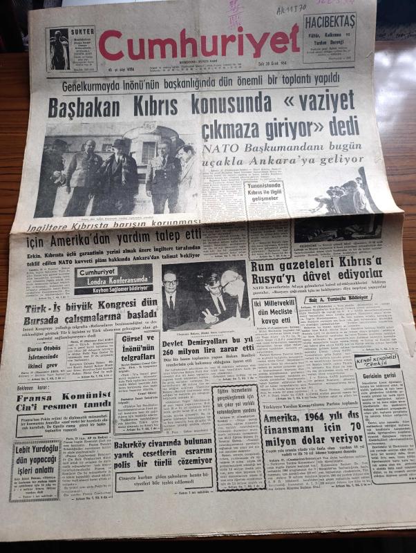 Cumhuriyet Gazetesi - 28 Ocak 1964 - Başbakan İsmet İnönü Kıbrıs konusunda Vaziyet çıkmaza giriyor dedi - İsmet İnönü Dün Genelkurmay'da yapılan toplantıdan çıkarken fotoğraf - NATO başkumandanı Bugün uçakla Ankara'ya geliyor - Ulaştırma Bakanı Ferit Alp İskender dünkü basın toplantısında fotoğraf - İngiltere Kıbrıs'ta barışın korunması için Amerika'dan yardım talep etti - Rum gazeteleri Kıbrıs'a Rusya'yı davet ediyorlar - Türk İş büyük Kongresi dün Bursa'da çalışmalarına başladı - Fransa komünist Çin'i resmen tanıdı - Bu rakamları ezberleyiniz yazan İlhan Selçuk - girizgahlar yazan Burhan Felek - Kafka'nın bir hikayesi Rusya'da yayınlandı - Beyrutta Twist evlere yayıldı - Telefunken - Avrupa karmasına seçilen Suat Mamat antrenmanda Fotoğrafı - Futbol Federasyonu Başkanı Orhan Şeref Apak dedi ki - İmam Hatip okulu güreşte İstanbul şampiyonu oldu - Innsbruck'ta Avusturya bayrağı yarıya indirildi - IX kış olimpiyatı - Spor toto'da bu hafta - 684 dakika gol yemeyen Da pozzo mağlup oldu, Yunus Nadi tarafından kaleme alınmıştır. Cumhuriyet Gazetesi - 28 Ocak 1964 - Başbakan İsmet İnönü Kıbrıs konusunda Vaziyet çıkmaza giriyor dedi - İsmet İnönü Dün Genelkurmay'da yapılan toplantıdan çıkarken fotoğraf - NATO başkumandanı Bugün uçakla Ankara'ya geliyor - Ulaştırma Bakanı Ferit Alp İskender dünkü basın toplantısında fotoğraf - İngiltere Kıbrıs'ta barışın korunması için Amerika'dan yardım talep etti - Rum gazeteleri Kıbrıs'a Rusya'yı davet ediyorlar - Türk İş büyük Kongresi dün Bursa'da çalışmalarına başladı - Fransa komünist Çin'i resmen tanıdı - Bu rakamları ezberleyiniz yazan İlhan Selçuk - girizgahlar yazan Burhan Felek - Kafka'nın bir hikayesi Rusya'da yayınlandı - Beyrutta Twist evlere yayıldı - Telefunken - Avrupa karmasına seçilen Suat Mamat antrenmanda Fotoğrafı - Futbol Federasyonu Başkanı Orhan Şeref Apak dedi ki - İmam Hatip okulu güreşte İstanbul şampiyonu oldu - Innsbruck'ta Avusturya bayrağı yarıya indirildi - IX kış olimpiyatı - Spor toto'da bu hafta - 684 dakika gol yemeyen Da pozzo mağlup oldu adlı eser Türkçe dilindedir.