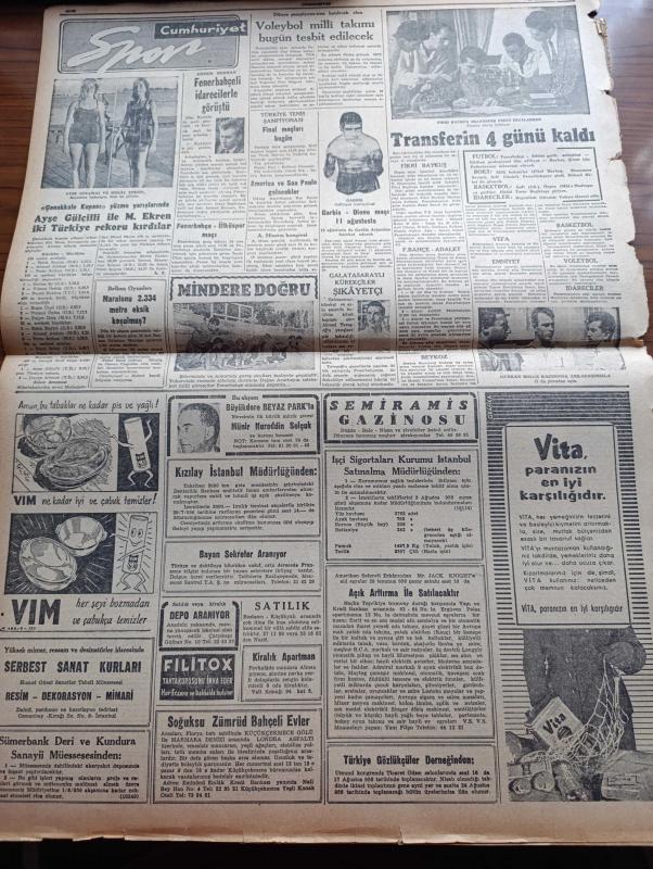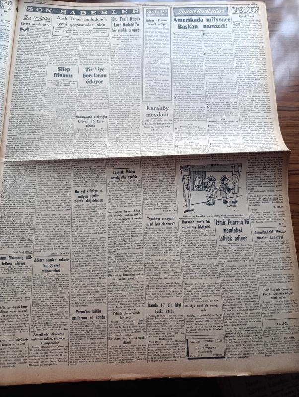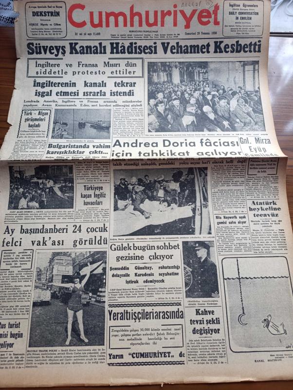 Cumhuriyet Gazetesi - 28 Temmuz 1956 - Süveyş Kanalı Hadisesi Vehamet Kesbetti - İngiltere Ve Fransa Mısırı Dün Şiddetle Protesto Ettiler - İngiltere'nin Süveyş Kanalı Tekrar İşgal Etmesi Israrla İstendi - Türk Afgan Görüşmeleri Başlandı - Ay Başından Beri 24 Çocuk Felci Vakası Görüldü - Mayolu Trafik Polisi - Rita Hayworth Uçak Gemisi Satın Alıyor - Andrea Doria Faciası İçin Tahkikat Açılıyor - Pakistan Cumhurbaşkanı Ekselans General İskender Mirza Eyüp Camiinde - Atatürk Heykeline Tecavüz - Karanlıkta Sesler Yazan Perihan Zorlu Yazı Dizisi - İki Devrin Perde Arkası Yazan Samih Nafiz Tansu Yazı Dizisi - Yılın İlk Yarısında Türkiye'de Basılan Eserler - Arab İsrail Hududunda Yeni Çarpışmalar Oldu - Çukurova'da Elektriğin Kilovatı 15 Kuruş Olacak - İzmir Fuarına 16 Devlet İştirak Ediyor - Karacaoğlan Yazan Yaşar Kemal Resimleyen Münif Fehim Yazı Dizisi - Resimli Romanımız Kraliçenin Gerdanlığı Yazan P. Gordeaux - Çanakkale Kupası Yüzme Yarışlarında Ayşe Gülçilli İle Meral Ekren Rekor, Yunus Nadi tarafından kaleme alınmıştır. Cumhuriyet Gazetesi - 28 Temmuz 1956 - Süveyş Kanalı Hadisesi Vehamet Kesbetti - İngiltere Ve Fransa Mısırı Dün Şiddetle Protesto Ettiler - İngiltere'nin Süveyş Kanalı Tekrar İşgal Etmesi Israrla İstendi - Türk Afgan Görüşmeleri Başlandı - Ay Başından Beri 24 Çocuk Felci Vakası Görüldü - Mayolu Trafik Polisi - Rita Hayworth Uçak Gemisi Satın Alıyor - Andrea Doria Faciası İçin Tahkikat Açılıyor - Pakistan Cumhurbaşkanı Ekselans General İskender Mirza Eyüp Camiinde - Atatürk Heykeline Tecavüz - Karanlıkta Sesler Yazan Perihan Zorlu Yazı Dizisi - İki Devrin Perde Arkası Yazan Samih Nafiz Tansu Yazı Dizisi - Yılın İlk Yarısında Türkiye'de Basılan Eserler - Arab İsrail Hududunda Yeni Çarpışmalar Oldu - Çukurova'da Elektriğin Kilovatı 15 Kuruş Olacak - İzmir Fuarına 16 Devlet İştirak Ediyor - Karacaoğlan Yazan Yaşar Kemal Resimleyen Münif Fehim Yazı Dizisi - Resimli Romanımız Kraliçenin Gerdanlığı Yazan P. Gordeaux - Çanakkale Kupası Yüzme Yarışlarında Ayşe Gülçilli İle Meral Ekren Rekor adlı eser Türkçe dilindedir.