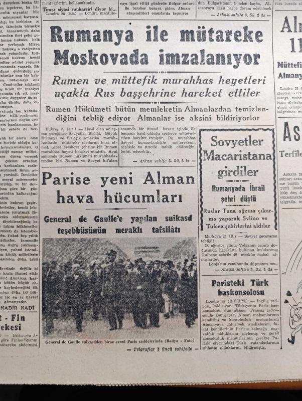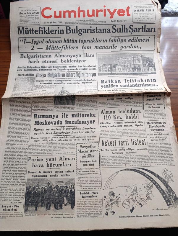 Cumhuriyet Gazetesi - 29 Ağustos 1944 - Harb Ahlakı Yazan Nadir Nadi Köşe Yazısı - Müttefiklerin Bulgaristan Sulh Şartları - 1 İşgal Olunan Bütün Toprakların Tahliye Edilmesi 2 Müttefiklere Tam Manasıyla Yardım - Bulgaristan'ın Almanya'ya İlanı Harb Etmesi Bekleniyor - Müstakbel Balkan Konferansının İçinde Toplanması Düşünülen Dolmabahçe Sarayı Fotoğraf- Alman Hududuna 110 Km. Kaldı - Paris'e Yeni Alman Hava Hücumları - Sovyetler Macaristana Girdiler - Kazanova Maceraları Taksim Belediye Gazinosunda - Askeri Vaziyet Yazan Emekli General H. Emir Erkilet Yazı Dizisi - Bulgaristan Ve Romanya Mihvere Nasıl Girmişlerdi Yazan Eski Romanya Hariciye Nazırı M. G. Gafenku - Bulgaristan Ve Müttefikler Yazan Ömer Rıza Doğrul Köşe Yazısı - Maarif Vekili Hasan Ali Yücel Dün Hadımköyüne Gitti - Yahudiler Hakkında Tahdidat Kaldırıldı - Kırışın Bakalım Yazan Burhan Felek Köşe Yazısı - Bugünkü Radyo Programı - Fenni Sünnetçi Emin Fidan - Borsa - Sadi Tek Tiyatrosu Suad Gün Konseri - Yeni Halk Opereti adlı eser, Kitap > Süreli Yayınlar > Gazeteler > Türkiye > Genel > Günlük kategorisinde İkinci El olarak satıştadır.