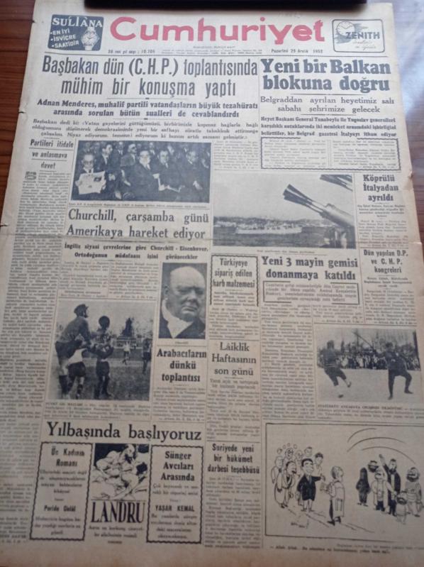 Cumhuriyet Gazetesi - 29 Aralık 1952 - Başbakan Adnan Menderes Dün Cumhuriyet Halk Partisi Toplantısında Mühim Bir Konuşma Yaptı - Yeni Bir Balkan Blokuna Doğru - Churchill Çarşamba Günü Amerika'ya Hareket Ediyor - Beşiktaş İstanbulspor'u Mağlup Etti - Laiklik Haftasının Son Günü - Arabacıların Dünkü Toplantısı - Yeni 3 Mayın Gemisi Donanmaya Katıldı - Hasan Ali Yücel Köşe Yazısı - Stalin'in Yanlış Çıkan Hesapları - Burhan Felek - Hindistan Komünist Çin'i İtham Ediyor - Danimarka Ana Kraliçesi Alexandra Öldü - Ka Me Fa Eşarpları - Nacar Saatleri - Arı Bisküvileri - Mumlu Lüks Kibritleri - Pasifik'te Paskalya Adasının Esrarı - Hamiyet Yüceses'e Göre Siemens Türk Köylüsünün Hasret Çektiği Radyodur - En Mükemmel Yılbaşı Hediyesi Philips Radyo - Volvo Traktör - Varta Akümülatörleri McCormick İnternational Traktör Makine Ve Ekipman adlı eser, Kitap > Süreli Yayınlar > Gazeteler > Türkiye > Genel > Günlük kategorisinde İkinci El olarak satıştadır.