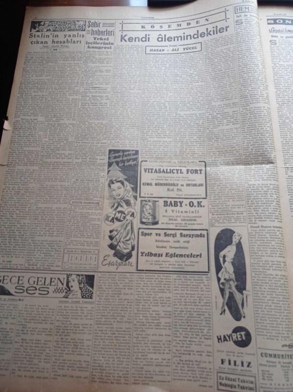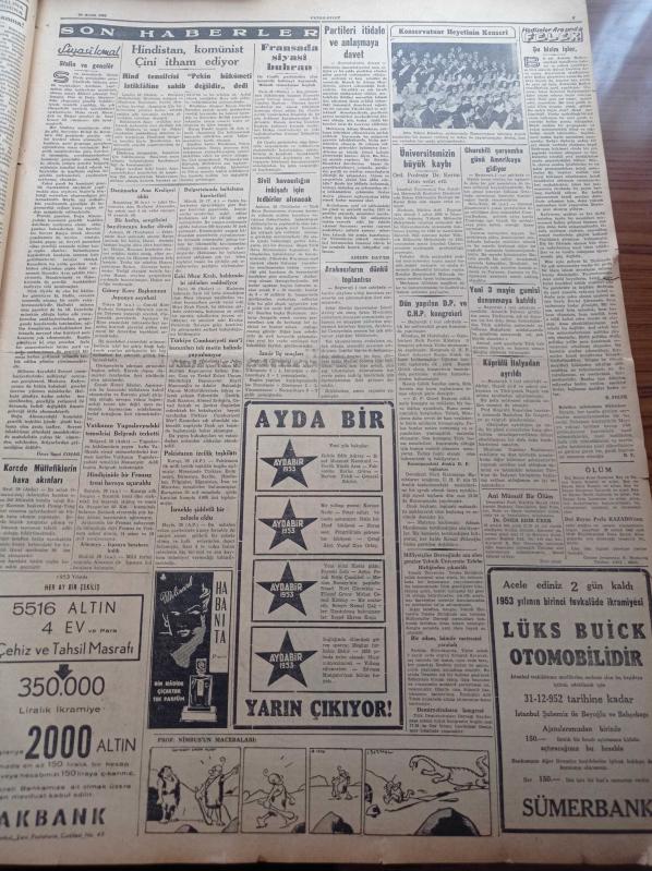 Cumhuriyet Gazetesi - 29 Aralık 1952 - Başbakan Adnan Menderes Dün Cumhuriyet Halk Partisi Toplantısında Mühim Bir Konuşma Yaptı - Yeni Bir Balkan Blokuna Doğru - Churchill Çarşamba Günü Amerika'ya Hareket Ediyor - Beşiktaş İstanbulspor'u Mağlup Etti - Laiklik Haftasının Son Günü - Arabacıların Dünkü Toplantısı - Yeni 3 Mayın Gemisi Donanmaya Katıldı - Hasan Ali Yücel Köşe Yazısı - Stalin'in Yanlış Çıkan Hesapları - Burhan Felek - Hindistan Komünist Çin'i İtham Ediyor - Danimarka Ana Kraliçesi Alexandra Öldü - Ka Me Fa Eşarpları - Nacar Saatleri - Arı Bisküvileri - Mumlu Lüks Kibritleri - Pasifik'te Paskalya Adasının Esrarı - Hamiyet Yüceses'e Göre Siemens Türk Köylüsünün Hasret Çektiği Radyodur - En Mükemmel Yılbaşı Hediyesi Philips Radyo - Volvo Traktör - Varta Akümülatörleri McCormick İnternational Traktör Makine Ve Ekipman, Yunus Nadi tarafından kaleme alınmıştır. Cumhuriyet Gazetesi - 29 Aralık 1952 - Başbakan Adnan Menderes Dün Cumhuriyet Halk Partisi Toplantısında Mühim Bir Konuşma Yaptı - Yeni Bir Balkan Blokuna Doğru - Churchill Çarşamba Günü Amerika'ya Hareket Ediyor - Beşiktaş İstanbulspor'u Mağlup Etti - Laiklik Haftasının Son Günü - Arabacıların Dünkü Toplantısı - Yeni 3 Mayın Gemisi Donanmaya Katıldı - Hasan Ali Yücel Köşe Yazısı - Stalin'in Yanlış Çıkan Hesapları - Burhan Felek - Hindistan Komünist Çin'i İtham Ediyor - Danimarka Ana Kraliçesi Alexandra Öldü - Ka Me Fa Eşarpları - Nacar Saatleri - Arı Bisküvileri - Mumlu Lüks Kibritleri - Pasifik'te Paskalya Adasının Esrarı - Hamiyet Yüceses'e Göre Siemens Türk Köylüsünün Hasret Çektiği Radyodur - En Mükemmel Yılbaşı Hediyesi Philips Radyo - Volvo Traktör - Varta Akümülatörleri McCormick İnternational Traktör Makine Ve Ekipman adlı eser Türkçe dilindedir.