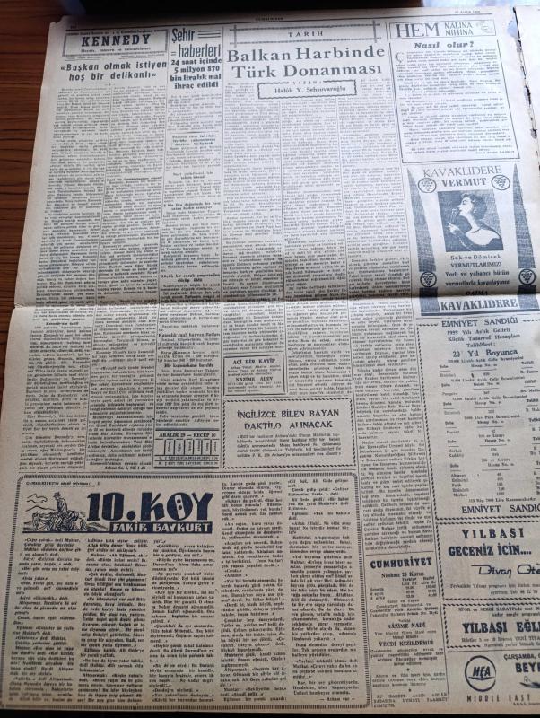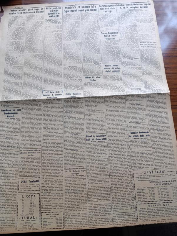 Cumhuriyet Gazetesi - 29 Aralık 1960 - Nezaret Altında Bulunan 65 Kişinin İsimleri Açıklandı - Mühim Bir Edebi Hadise Ölümünden 4 Yıl Sonra Reşat Nuri Güntekin'in Bir Romanı Bulundu - İstanbul Temsilciliklerinin Hepsini CHP Adayları Kazandı - Profesör Tarık Zafer Tunaya - Devlet Ve Hükümet Başkanı Cemal Gürsel İç Olaylarla İlgili Bir Demeç Verdi - Uşak Hadiseleri Sanıkları İçin 20 Yıla Kadar Hapis İsteniyor - Topkapı Olayları Günü Teybe Alınan Bir Telsiz Muhaberesi Dinletildi - 60 Sabıkın Gayrımeşru Serveti 12 Milyon Lira - 147'lerle İlgili Kanunun 5. Maddesi Kaldırılıyor - Atatürk'e El Uzatan Köy Öğretmeni Nasıl Yakalandı - 10. Köy Yazan Fakir Baykurt Yazı Dizisi - Amerika'nın En Genç Cumhurbaşkanı Kennedy Hayatı Macera Ve Mücadeleleri Yazan James MacGregor Yazı Dizisi - Burhan Felek Köşe Yazısı - Belçika'da Devam Eden Grevler Siyasi Ve İhtilalci Mahiyette Görülüyor - Af Kanunundan Bu Yana İstanbul'da 172 Hırsızlık Vakası Tesbit Edildi - Galatasaray Lisesi Orta Grup Şampiyonu Oldu, Yunus Nadi tarafından kaleme alınmıştır. Cumhuriyet Gazetesi - 29 Aralık 1960 - Nezaret Altında Bulunan 65 Kişinin İsimleri Açıklandı - Mühim Bir Edebi Hadise Ölümünden 4 Yıl Sonra Reşat Nuri Güntekin'in Bir Romanı Bulundu - İstanbul Temsilciliklerinin Hepsini CHP Adayları Kazandı - Profesör Tarık Zafer Tunaya - Devlet Ve Hükümet Başkanı Cemal Gürsel İç Olaylarla İlgili Bir Demeç Verdi - Uşak Hadiseleri Sanıkları İçin 20 Yıla Kadar Hapis İsteniyor - Topkapı Olayları Günü Teybe Alınan Bir Telsiz Muhaberesi Dinletildi - 60 Sabıkın Gayrımeşru Serveti 12 Milyon Lira - 147'lerle İlgili Kanunun 5. Maddesi Kaldırılıyor - Atatürk'e El Uzatan Köy Öğretmeni Nasıl Yakalandı - 10. Köy Yazan Fakir Baykurt Yazı Dizisi - Amerika'nın En Genç Cumhurbaşkanı Kennedy Hayatı Macera Ve Mücadeleleri Yazan James MacGregor Yazı Dizisi - Burhan Felek Köşe Yazısı - Belçika'da Devam Eden Grevler Siyasi Ve İhtilalci Mahiyette Görülüyor - Af Kanunundan Bu Yana İstanbul'da 172 Hırsızlık Vakası Tesbit Edildi - Galatasaray Lisesi Orta Grup Şampiyonu Oldu adlı eser Türkçe dilindedir.