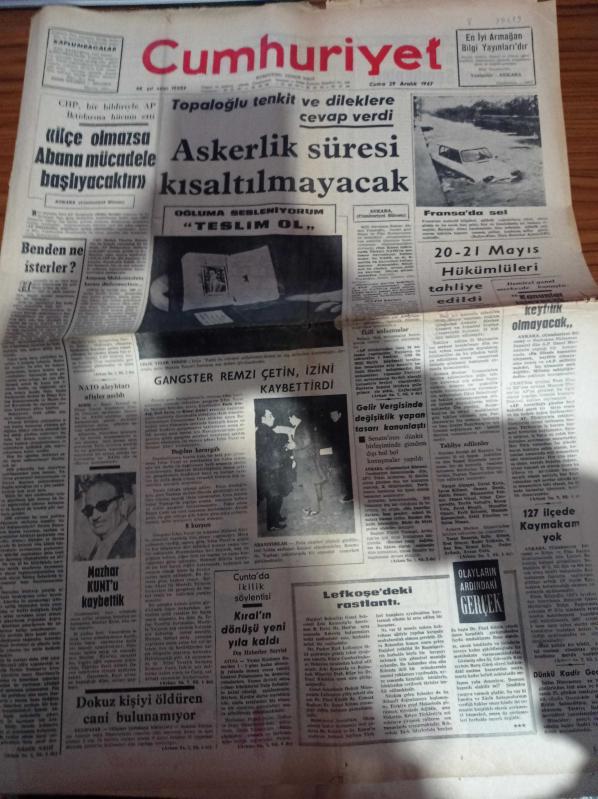 Cumhuriyet Gazetesi - 29 Aralık 1967 - Che Guevara Nasıl Öldü - Beşiktaş Ankara'ya Gitti Fenerbahçe Kampa Giriyor - İstanbul Boks Şampiyonası Çetin Geçiyor - Cemal Kamacı 11 Ocak Günü Alman Boksörü Klass İle Karşılaşılıyor - Milli Savunma Bakanı Ahmet Topaloğlu Askerlik Süresi Kısaltılmayacak - 20 21 Mayıs Hükümlüleri Tahliye Edildi - İlçe Olmazsa Abana Mücadele Başlayacaktır - Gangster Remzi Çetin izini Kaybettirdi - Vietnam'daki ABD Erleri Marijuna Kullanıyor adlı eser Türkçe dilindedir.