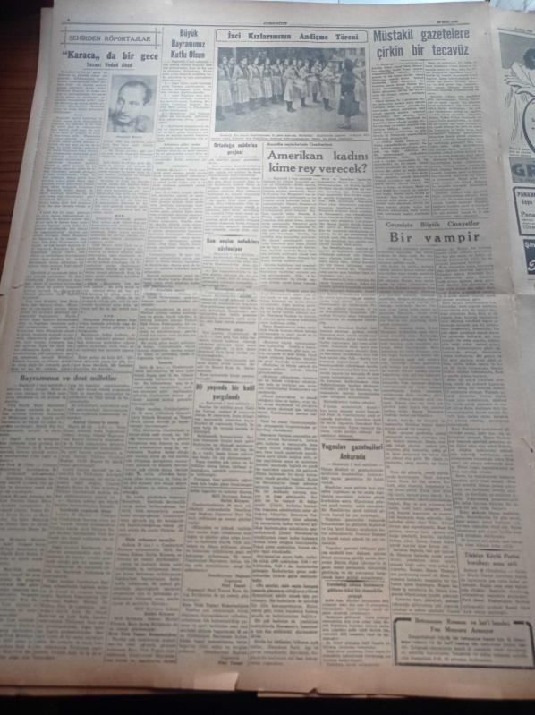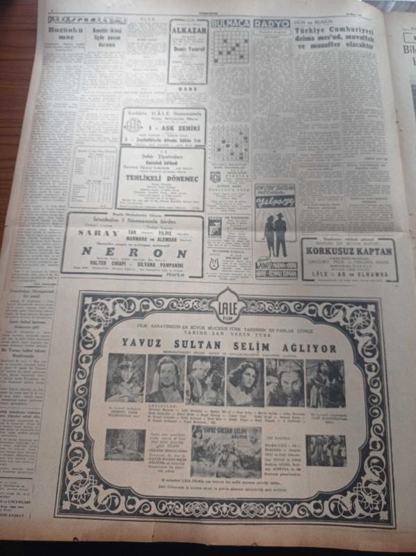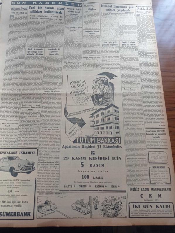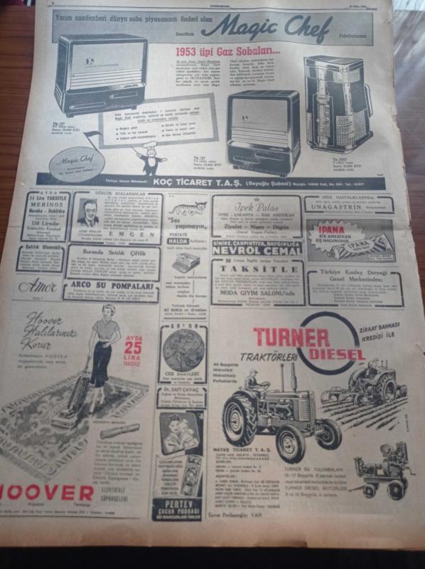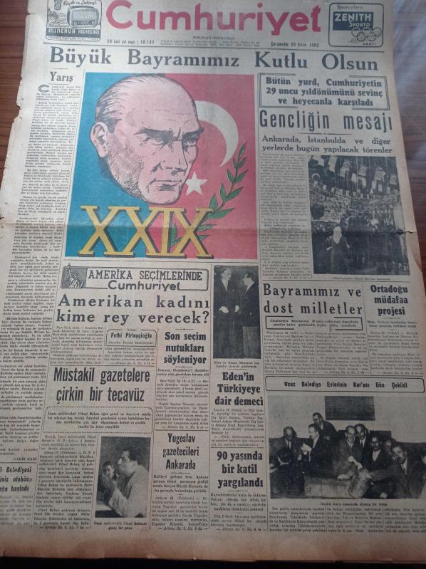 Cumhuriyet Gazetesi - 29 Ekim 1952 - Büyük Bayramınız Kutlu Olsun - Gazi Mustafa Kemal Atatürk - Bütün Yurd Cumhuriyetin 29. Yıldönümü Sevinç Ve Heyecanla Karşıladı - Amerika Seçimlerinde Cumhuriyet - Amerikan Kadını Kime Rey Verecek - Denizli Belediyesi Biletçisiz Otobüs İşletmeğe Başladı - İzmir Milletvekili Cihad Babanın Güzel Bir Pozu - Cumhuriyet Bayramımız Ve Dost Milletler - İngiltere Dışişleri Bakanı Eden'in Türkiye'ye Dair Demeci - İstanbul Belediye Sarayı 6 Milyon Liraya Mal Olacak - Yeni Bir Harbde Atom Silahları Kullanılacak - İngiliz Kraliçesi Elizabeth Charlie Chaplin İle Tanıştı - Burhan Felek - Fenerbahçe Havagücünü Yendi - Yavuz Sultan Selim Ağlıyor Filmi - Feridun Fazıl Tülbentçi - Altan Karındaş - Lale Oraloğlu - Şaziye Moral - Geçmişte Büyük Cinayetler Yazı Dizisi - Muammer Karaca - Vedad Abud - Gripin - Technos - Magic Chef 1953 Tipi Gaz Sobaları - Hoover Elektrik Süpürgesi - İpana Diş - Arion Cep adlı eser, Kitap > Süreli Yayınlar > Gazeteler > Türkiye > Genel > Günlük kategorisinde İkinci El olarak satıştadır.