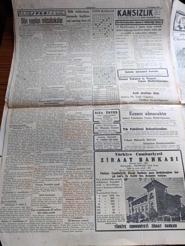 Cumhuriyet Gazetesi - 29 İkincikanun (Ocak) 1940 - Bitarafların İttifakı Yazan Yunus Nadi Başmakale - Milli Felaketimiz Karşısında İngiltere'nin Uzattığı Dost Eli - Balkan Antantı Konseyinin Toplanacağı Belgrad'dan Bir Manzara - İngiliz Askerleri Garp Cephesinde Radyo Dinliyorlar - Fenerbahçe Vefa Maçı Fotoğraf - Milli Şef İsmet İnönü'nün Memleket Seyahati - Roma imparatorluğunun Tarihi Hazineleri - Askerlik Bahisleri Yazan Abidin Daver - Maarif Vekili Hasan Ali Yücel Geliyor - Zaza Filmi Pek Yakında Saray Sinemasında - Hindliler Geliyor Alkazar Sinemasında - İsa Miranda Ray Milland'ın Yarattığı Otel Emperyal Perşembe Akşamı Lale Sinemasında - Hungarya 8 Şişli 1 - Beşiktaş 4 Süleymaniye 1 - Galatasaray 6 Topkapı 0 - Çocuk Köşesi - General Weygand Şerefine Verilen Ziyafet -- Burla Biraderler - Singer Saat - Milli Piyango - Dolmabahçe Stadyumu İnşaatı, Yunus Nadi tarafından kaleme alınmıştır. Cumhuriyet Gazetesi - 29 İkincikanun (Ocak) 1940 - Bitarafların İttifakı Yazan Yunus Nadi Başmakale - Milli Felaketimiz Karşısında İngiltere'nin Uzattığı Dost Eli - Balkan Antantı Konseyinin Toplanacağı Belgrad'dan Bir Manzara - İngiliz Askerleri Garp Cephesinde Radyo Dinliyorlar - Fenerbahçe Vefa Maçı Fotoğraf - Milli Şef İsmet İnönü'nün Memleket Seyahati - Roma imparatorluğunun Tarihi Hazineleri - Askerlik Bahisleri Yazan Abidin Daver - Maarif Vekili Hasan Ali Yücel Geliyor - Zaza Filmi Pek Yakında Saray Sinemasında - Hindliler Geliyor Alkazar Sinemasında - İsa Miranda Ray Milland'ın Yarattığı Otel Emperyal Perşembe Akşamı Lale Sinemasında - Hungarya 8 Şişli 1 - Beşiktaş 4 Süleymaniye 1 - Galatasaray 6 Topkapı 0 - Çocuk Köşesi - General Weygand Şerefine Verilen Ziyafet -- Burla Biraderler - Singer Saat - Milli Piyango - Dolmabahçe Stadyumu İnşaatı adlı eser Türkçe dilindedir.