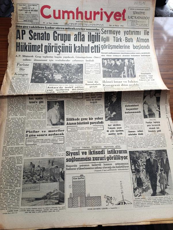 Cumhuriyet Gazetesi - 29 Mayıs 1962 - Paris'te Bir Kongre Yazan Nadir Nadi Başmakale - Adalet Partisi Senato Grubu Afla İlgili Hükümet Görüşünü Kabul Etti - Sermaye Yatırımı İle İlgili Türk Batı Alman Görüşmelerine Başlandı - İkinci İmar Ve İskân Kongresi Açıldı - Of'lu Mehmet Reis Uçakla İsrail'e Gitti - Plajlar Ve Moteller 3 Gün Sonra Açılacak - Silifke'de Genç Bir Yobaz Atanın Büstünü Parçaladı - İsmet İnönü'yü Öldüreceğim Diyen Sarhoş Önce Tevkif Edildi Sonra Serbest Bırakıldı - Bir Daha Bir Daha Yazan İlhan Selçuk Köşe Yazısı - Son Macera Yazan Maurice Dekobra Yazı Dizisi - Franco Din Adamlarını İspanyol Grevcilerini Tahrik Etmekle Suçladı - Kızıl Çin'de Açlık - Havada Laflar Yazan Burhan - Brigitte Bardot'un Halefi Kim Olacak - Resimli Roman Melun Kız Çizen Yves Sayol - Bay Oscar Karikatür - Mersin Petrolünün İlk Partisi İstanbul'a Geliyor - Bingöl'de Liseliler Paydos'u Temsil Etti - 400 Metre Engellide Fahir Özgüden 5000 Metrede Muharrem Dalkılıç Birinci Geldiler - Fenerbahçe adlı eser, Kitap > Süreli Yayınlar > Gazeteler > Türkiye > Genel > Günlük kategorisinde İkinci El olarak satıştadır.