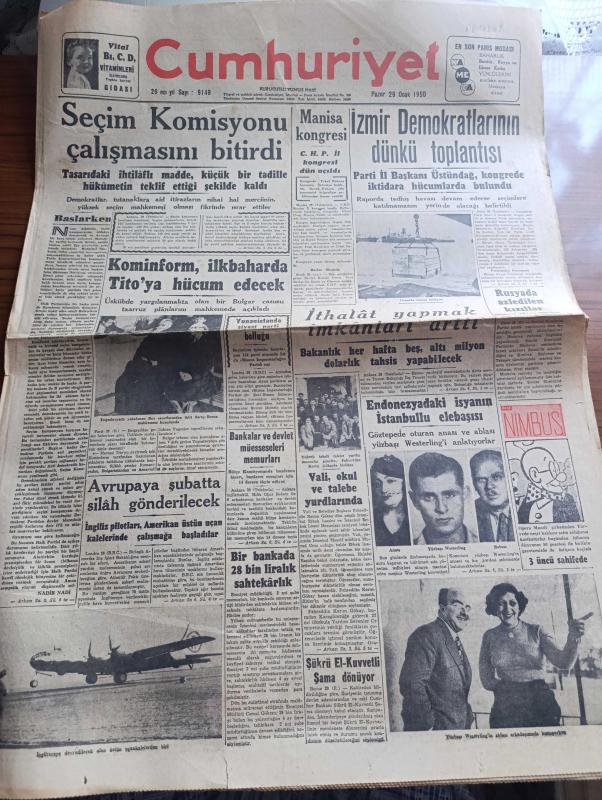 Cumhuriyet Gazetesi - 29 Ocak 1950 - başlarken yazan Nadir Nadi Başmakale - seçim komisyonu çalışmasını bitirdi - Manisa Kongresi CHP İl Kongresi dün açıldı - Kominform ilkbaharda Tito'ya hücum edecek - İzmir demokratlarının dünkü toplantısı - Demokrat Parti İl Başkanı Ekrem Hayri Üstündağ kongre'de iktidara hücumlarda bulundu - Avrupa'ya şubatta silah gönderilecek - Vali Fahrettin Kerim Gökay okul ve talebe yurtlarında fotoğraf - Endonezya'daki isyanın İstanbullu elebaşısı yüzbaşı Westerling fotoğraf - Haftanın Şakaları Yazan Burhan Felek - İlk meclisi mebusan reisi Ahmet Rıza Beyin hatıraları yazı dizisi - hemşerilerimle yazan Falih Rıfkı Atay - Nuh'un gemisi kanada'da - Ölüme Doğru Yazan Agatha Christie yazı dizisi - 1949-1950 Yunus Nadi mükafatı bir yurt yazısı Yeşilhisar - İstanbul Basketbol Şampiyonası - Zorlu misafir Bugün Melek sinemasında - Pisa'nın eğri kulesi yıkılma tehlikesinde fotoğraf - Yılmaz Reis ipek sinemasında - Patrik Athegonaras ve Muammer Karaca fotoğraf, Yunus Nadi tarafından kaleme alınmıştır. Cumhuriyet Gazetesi - 29 Ocak 1950 - başlarken yazan Nadir Nadi Başmakale - seçim komisyonu çalışmasını bitirdi - Manisa Kongresi CHP İl Kongresi dün açıldı - Kominform ilkbaharda Tito'ya hücum edecek - İzmir demokratlarının dünkü toplantısı - Demokrat Parti İl Başkanı Ekrem Hayri Üstündağ kongre'de iktidara hücumlarda bulundu - Avrupa'ya şubatta silah gönderilecek - Vali Fahrettin Kerim Gökay okul ve talebe yurtlarında fotoğraf - Endonezya'daki isyanın İstanbullu elebaşısı yüzbaşı Westerling fotoğraf - Haftanın Şakaları Yazan Burhan Felek - İlk meclisi mebusan reisi Ahmet Rıza Beyin hatıraları yazı dizisi - hemşerilerimle yazan Falih Rıfkı Atay - Nuh'un gemisi kanada'da - Ölüme Doğru Yazan Agatha Christie yazı dizisi - 1949-1950 Yunus Nadi mükafatı bir yurt yazısı Yeşilhisar - İstanbul Basketbol Şampiyonası - Zorlu misafir Bugün Melek sinemasında - Pisa'nın eğri kulesi yıkılma tehlikesinde fotoğraf - Yılmaz Reis ipek sinemasında - Patrik Athegonaras ve Muammer Karaca fotoğraf adlı eser Türkçe dilindedir.