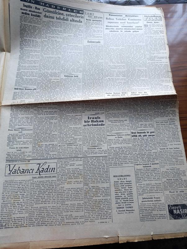 Cumhuriyet Gazetesi - 29 Temmuz 1947 - Endonezya'da Yazan Nadir Nadi Köşe Yazısı - CHP'de Beklenen Mühim Değişiklikler - CHP Genel Sekreterliğine Şükrü Kaya Veya Rauf Orbay Getirileceği Söyleniyor - Cumhurbaşkanı İsmet İnönü Dün İstanbul'a Geldi - Gümülcine Çetecilerin Daimi Tehdidi Altında - Celal Bayar Çeşmeye Gitti - İngiliz İmparatorluğu Sergisi Dün Açıldı - Askeri Şura Dün İstanbul'da Toplandı - Erzurum'da Değerli Bir Sanat Sergisi Yazan Ahmed Halil - İsmail Dümbüllü Tiyatrosu Bu Akşam Suadiye Çınardibinde - Yabancı Kadın Yazan Ahmed Hidayet Reel Yazı Dizisi - Çimento Davası Yazan Burhan Felek - Amerika'nın Türkiye'ye Yardımı Ve Ruslar - Büyük Konser Safiye Ayla Ve Münir Nurettin Selçuk Cağaloğlu Çiftesaraylar Bahçesinde - 1947 1948 Yunus Nadi Mükafatı En Güzel Hikaye 1939 Çocukları Yazan Raif Seyhan - Oxford Keskin Ağızlı Traş Bıçağı - Pertev Pudrası - Müzeyyen Senar Işıl Konseri Caddebostan Marmara Kulübünde - Jeep İşbaşında - Bugünkü Radyo Programı adlı eser, Kitap > Süreli Yayınlar > Gazeteler > Türkiye > Genel > Günlük kategorisinde İkinci El olarak satıştadır.