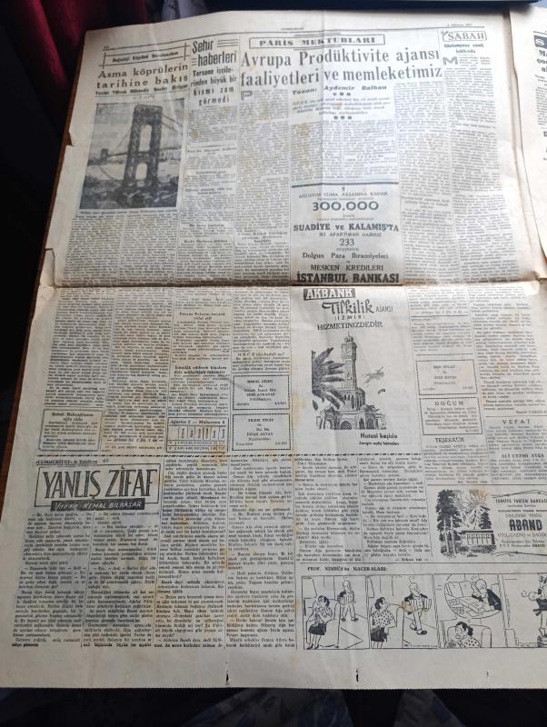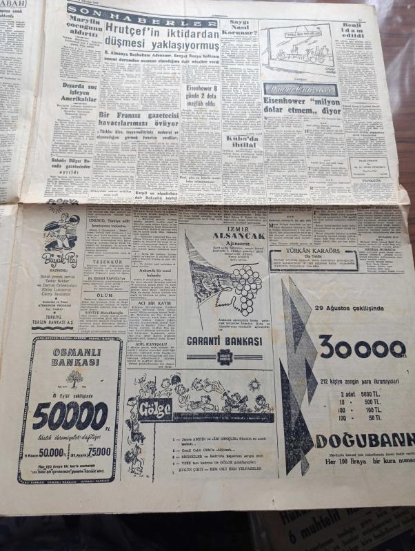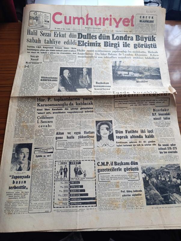 Cumhuriyet Gazetesi - 3 Ağustos 1957 - Saygı Nasıl Korunur Yazan Nadir Nadi Başmakale - Japon Gazeteci Minoru Hirano Japonya'da Basın Serbesttir Dedi - Halil Sezai Erkut Dün Sabah Tahliye Edildi - Amerikan Dışişleri Bakanı John Foster Dulles Dün Londra'da Büyük Elçimiz Muharrem Nuri Birgi İle Görüştü - Silahsızlanma Konferansı - Hürriyet Partisi Toplantılarına Yarın Fevzi Lütfi Karaosmanoğlu Da Katılacak - Maruf İngiliz Sanatkarı Vivien Leigh- Ege'de Kuraklık Ve Şiddetli Sıcaklar - Yanlış Zifaf Yazan Kemal Bilbaşar Yazı Dizisi - Boğaziçi Köprüsü Hazırlanırken Yazan Yüksek Mühendis Necdet Dirilgen Yazı - Marilyn Monroe Çocuğunu Aldırttı - Hrutçef'in İktidardan Düşmesi Yaklaşıyormuş - Küba'da İhtilal - Köpek Benji İdam edildi - Büyük Casuslar Derleyen A. Cemalettin Saraçoğlu - Ses Sanatkarı Muzaffer Akgün Büyükdere Beyaz Parkta - Futbolcu Hilmi Kiremitçi Transfer Konusunda Dördüncü Defa Karar Değiştirdi - Beykoz Mevsimi Merasimle Açtı - 5. Yıl Ahmed Reis Yelken Yarışı Bugün Yapılıyor, Yunus Nadi tarafından kaleme alınmıştır. Cumhuriyet Gazetesi - 3 Ağustos 1957 - Saygı Nasıl Korunur Yazan Nadir Nadi Başmakale - Japon Gazeteci Minoru Hirano Japonya'da Basın Serbesttir Dedi - Halil Sezai Erkut Dün Sabah Tahliye Edildi - Amerikan Dışişleri Bakanı John Foster Dulles Dün Londra'da Büyük Elçimiz Muharrem Nuri Birgi İle Görüştü - Silahsızlanma Konferansı - Hürriyet Partisi Toplantılarına Yarın Fevzi Lütfi Karaosmanoğlu Da Katılacak - Maruf İngiliz Sanatkarı Vivien Leigh- Ege'de Kuraklık Ve Şiddetli Sıcaklar - Yanlış Zifaf Yazan Kemal Bilbaşar Yazı Dizisi - Boğaziçi Köprüsü Hazırlanırken Yazan Yüksek Mühendis Necdet Dirilgen Yazı - Marilyn Monroe Çocuğunu Aldırttı - Hrutçef'in İktidardan Düşmesi Yaklaşıyormuş - Küba'da İhtilal - Köpek Benji İdam edildi - Büyük Casuslar Derleyen A. Cemalettin Saraçoğlu - Ses Sanatkarı Muzaffer Akgün Büyükdere Beyaz Parkta - Futbolcu Hilmi Kiremitçi Transfer Konusunda Dördüncü Defa Karar Değiştirdi - Beykoz Mevsimi Merasimle Açtı - 5. Yıl Ahmed Reis Yelken Yarışı Bugün Yapılıyor adlı eser Türkçe dilindedir.
