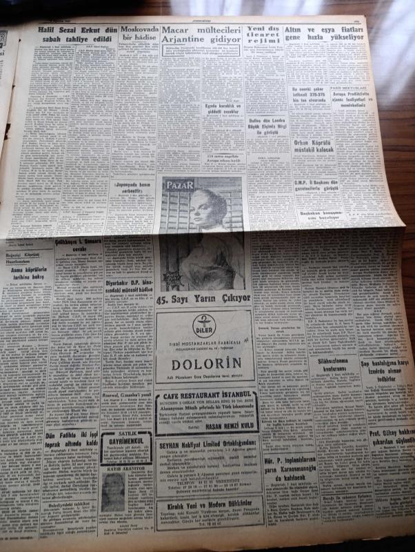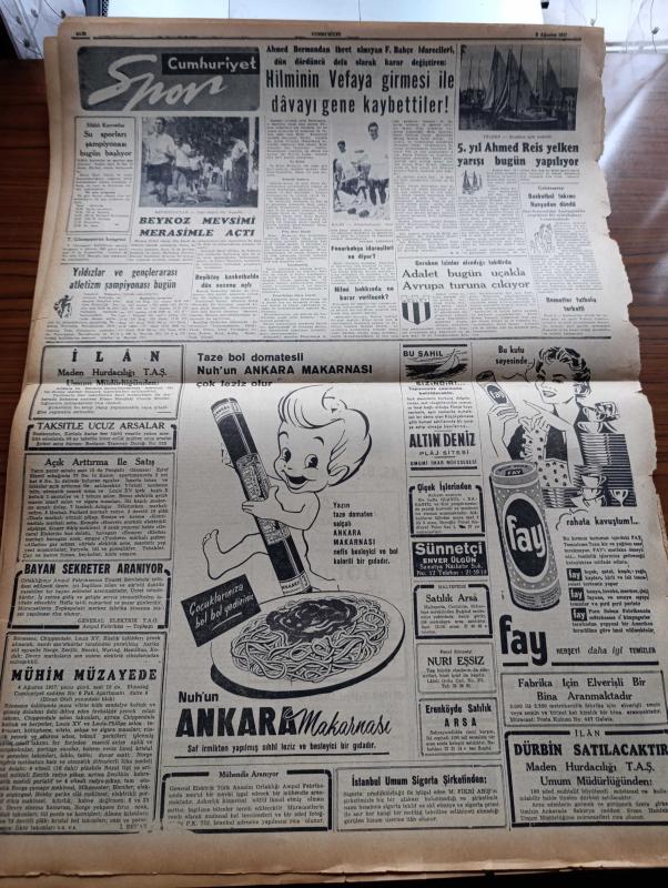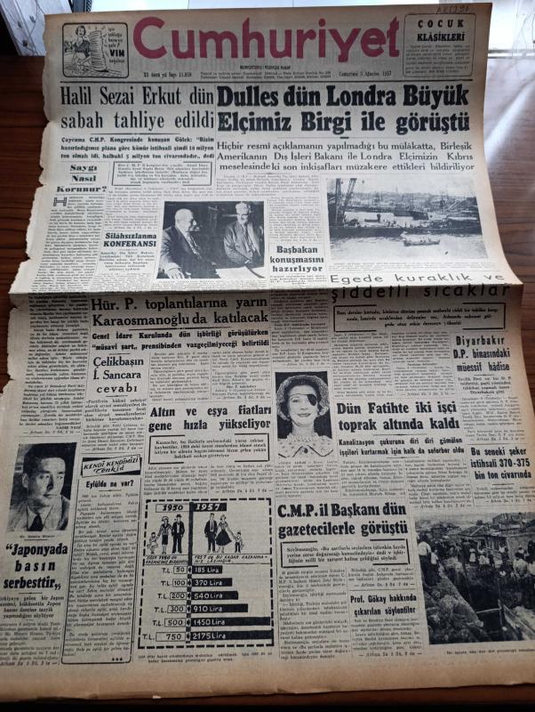 Cumhuriyet Gazetesi - 3 Ağustos 1957 - Saygı Nasıl Korunur Yazan Nadir Nadi Köşe Yazısı - Japon Gazeteci Minoru Hirano Japonya'da Basın Serbesttir Dedi - Halil Sezai Erkut Dün Sabah Tahliye Edildi - Amerikan Dışişleri Bakanı John Foster Dulles Dün Londra'da Büyük Elçimiz Birgi İle Görüştü - Silahsızlanma Konferansı - Hürriyet Partisi Toplantılarına Yarın Fevzi Lütfi Karaosmanoğlu Da Katılacak - Ege'de Kuraklık Ve Şiddetli Sıcaklar - Yanlış Zifaf Yazan Kemal Bilbaşar Yazı Dizisi - Boğaziçi Köprüsü Hazırlanırken Yazan Yüksek Mühendis Necdet Dirilgen Yazı - Marilyn Monroe Çocuğunu Aldırttı - Hrutçef'in İktidardan Düşmesi Yaklaşıyormuş - Küba'da İhtilal - Köpek Benji İdam edildi - Resimli Romanımız Çifte Cinayet - Büyük Casuslar Derleyen A. Cemalettin Saraçoğlu - Ses Sanatkarı Muzaffer Akgün Büyükdere Beyaz Parkta - Futbolcu Hilmi Transfer Konusunda Dördüncü Defa Karar Değiştirdi - Beykoz Mevsimi Merasimle Açtı - 5. Yıl Ahmed Reis Yelken Yarışı Bugün Yapılıyor, Yunus Nadi tarafından kaleme alınmıştır. Cumhuriyet Gazetesi - 3 Ağustos 1957 - Saygı Nasıl Korunur Yazan Nadir Nadi Köşe Yazısı - Japon Gazeteci Minoru Hirano Japonya'da Basın Serbesttir Dedi - Halil Sezai Erkut Dün Sabah Tahliye Edildi - Amerikan Dışişleri Bakanı John Foster Dulles Dün Londra'da Büyük Elçimiz Birgi İle Görüştü - Silahsızlanma Konferansı - Hürriyet Partisi Toplantılarına Yarın Fevzi Lütfi Karaosmanoğlu Da Katılacak - Ege'de Kuraklık Ve Şiddetli Sıcaklar - Yanlış Zifaf Yazan Kemal Bilbaşar Yazı Dizisi - Boğaziçi Köprüsü Hazırlanırken Yazan Yüksek Mühendis Necdet Dirilgen Yazı - Marilyn Monroe Çocuğunu Aldırttı - Hrutçef'in İktidardan Düşmesi Yaklaşıyormuş - Küba'da İhtilal - Köpek Benji İdam edildi - Resimli Romanımız Çifte Cinayet - Büyük Casuslar Derleyen A. Cemalettin Saraçoğlu - Ses Sanatkarı Muzaffer Akgün Büyükdere Beyaz Parkta - Futbolcu Hilmi Transfer Konusunda Dördüncü Defa Karar Değiştirdi - Beykoz Mevsimi Merasimle Açtı - 5. Yıl Ahmed Reis Yelken Yarışı Bugün Yapılıyor adlı eser Türkçe dilindedir.