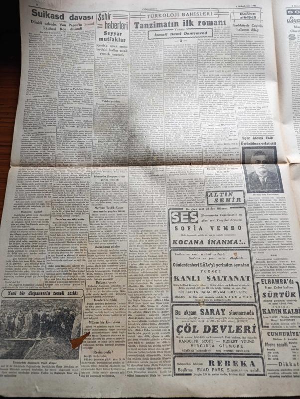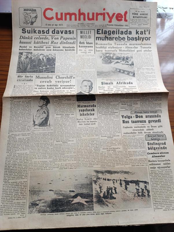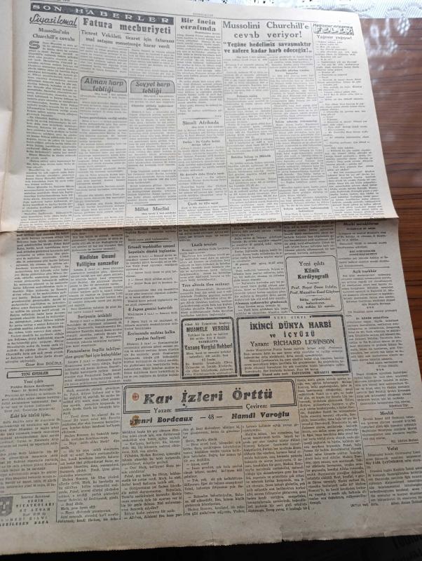 Cumhuriyet Gazetesi - 3 Birincikanun ( Aralık) 1942 - Bir Facia Etrafında 2 - Suikast Davası Dünkü Celsede Von Papen'in Hususi Katibesi Roz Dinlendi - Suikast Suçlularından Abdurrahman Kornilof Ve Pavlof Mahkeme Huzurunda Fotoğraf - Millet Meclisi Örfi İdare Kanununu Altı Ay Daha Temdid Etti - Mussolini Churchill'e Cevap Veriyor - Nafia Vekili Ali Fuad Cebesoy - Marmara'da Yapılacaktır İskeleler - Elageilada Kati Muharebe Başlıyor - Stalingrad Bölgesinde Çembere Alınanlar Almanlar - Şimali Afrika'da Darlan Bir İmparatorluk Konseyi Kurdu - Amerikan Ordusunun Şimali Afrika'ya Çıkışına Dair Radyo İle Nakledilen Resimler - Üsküdar Doğancılarda Şeyhülislam Ömer Efendi'nin Arsasında Verem Dispanserinin Temeli Atıldı Fotoğraf - Kızılay Seyyar Mutfaklar la Uzak Semtteki Halka Sıcak Yemek Verecek - Tanzimatın İlk Romanı Yazan İsmail Hami Danişmend Yazı Dizisi - Spor Hocası Faik Üstünidman Vefat Etti - Ses Sinemasında Yunanistan'ın En Güzel Sesi Tangolar Kraliçesi Sofia Vembo - Kar İzleri Örttü, Yunus Nadi tarafından kaleme alınmıştır. Cumhuriyet Gazetesi - 3 Birincikanun ( Aralık) 1942 - Bir Facia Etrafında 2 - Suikast Davası Dünkü Celsede Von Papen'in Hususi Katibesi Roz Dinlendi - Suikast Suçlularından Abdurrahman Kornilof Ve Pavlof Mahkeme Huzurunda Fotoğraf - Millet Meclisi Örfi İdare Kanununu Altı Ay Daha Temdid Etti - Mussolini Churchill'e Cevap Veriyor - Nafia Vekili Ali Fuad Cebesoy - Marmara'da Yapılacaktır İskeleler - Elageilada Kati Muharebe Başlıyor - Stalingrad Bölgesinde Çembere Alınanlar Almanlar - Şimali Afrika'da Darlan Bir İmparatorluk Konseyi Kurdu - Amerikan Ordusunun Şimali Afrika'ya Çıkışına Dair Radyo İle Nakledilen Resimler - Üsküdar Doğancılarda Şeyhülislam Ömer Efendi'nin Arsasında Verem Dispanserinin Temeli Atıldı Fotoğraf - Kızılay Seyyar Mutfaklar la Uzak Semtteki Halka Sıcak Yemek Verecek - Tanzimatın İlk Romanı Yazan İsmail Hami Danişmend Yazı Dizisi - Spor Hocası Faik Üstünidman Vefat Etti - Ses Sinemasında Yunanistan'ın En Güzel Sesi Tangolar Kraliçesi Sofia Vembo - Kar İzleri Örttü adlı eser Türkçe dilindedir.