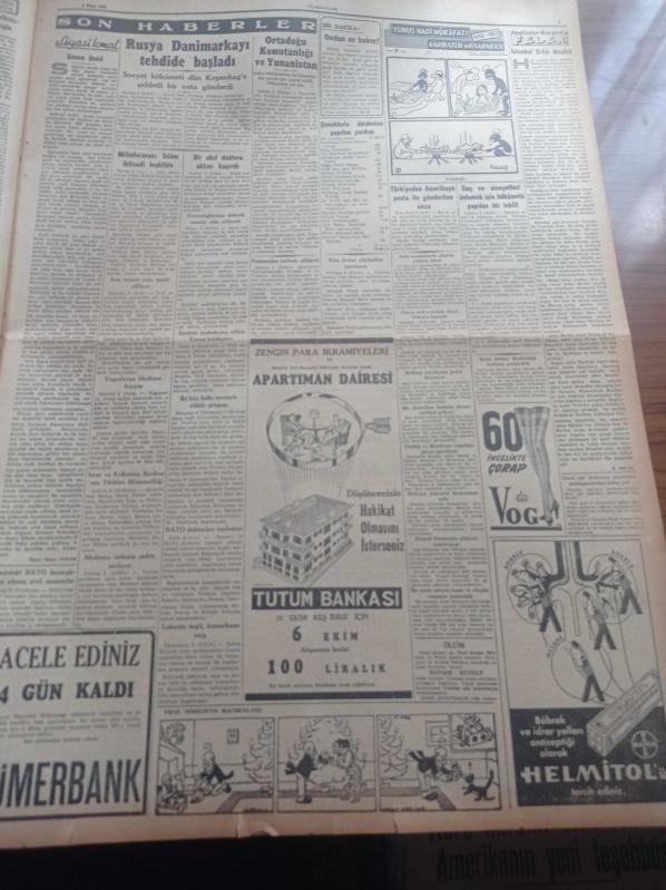 Cumhuriyet Gazetesi - 3 Ekim 1952 - Amiral McCormik Dün Sabah Ankara'ya Geldi - İran İngiltere İle Münasebeti Kesiyor - Japonya'da Kızılların Hezimeti - Amerika'da Seçim Kampanyası - Celal Bayar Murguldan Kars'a Hareket Etti - Göçmen Evlerinin Tevziine Başlandı - İsmet İnönünün Ege Seyahati - Stalin'in Hayali - Bizansın İçyüzü Yazı Dizisi - Rusya Danimarkayı Tehdide Başladı - Yunus Nadi Mükâfatı Karikatür Müsabakası - Burhan Felek - Vog Naylon - Medrano Sirkinin Çadırı Satılıyor - Geçmişte Büyük Cinayetler Yazı Dizisi - Hamiyet Yüceses - Hasan Oktay Gecesi - Lig Maçlarında Aksayan Noktalar - Mürüvvet Sim - Perihan Altındağ Sözeri - Yeni Radar Cihazı - Günün Resimleri - Sümerbank - Antifar Gözlükleri - Savaş Çil İlacı - Ericsson Elektrik Sayaçları - Brasso Maden - G.E.C Pilli Radyo Ve Bataryaları - Ferdi Tayfur Beyaz Parkta - İsolan Dürbünleri - Odeon Mağazaları, Yunus Nadi tarafından kaleme alınmıştır. Cumhuriyet Gazetesi - 3 Ekim 1952 - Amiral McCormik Dün Sabah Ankara'ya Geldi - İran İngiltere İle Münasebeti Kesiyor - Japonya'da Kızılların Hezimeti - Amerika'da Seçim Kampanyası - Celal Bayar Murguldan Kars'a Hareket Etti - Göçmen Evlerinin Tevziine Başlandı - İsmet İnönünün Ege Seyahati - Stalin'in Hayali - Bizansın İçyüzü Yazı Dizisi - Rusya Danimarkayı Tehdide Başladı - Yunus Nadi Mükâfatı Karikatür Müsabakası - Burhan Felek - Vog Naylon - Medrano Sirkinin Çadırı Satılıyor - Geçmişte Büyük Cinayetler Yazı Dizisi - Hamiyet Yüceses - Hasan Oktay Gecesi - Lig Maçlarında Aksayan Noktalar - Mürüvvet Sim - Perihan Altındağ Sözeri - Yeni Radar Cihazı - Günün Resimleri - Sümerbank - Antifar Gözlükleri - Savaş Çil İlacı - Ericsson Elektrik Sayaçları - Brasso Maden - G.E.C Pilli Radyo Ve Bataryaları - Ferdi Tayfur Beyaz Parkta - İsolan Dürbünleri - Odeon Mağazaları adlı eser Türkçe dilindedir.