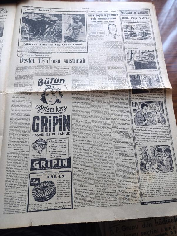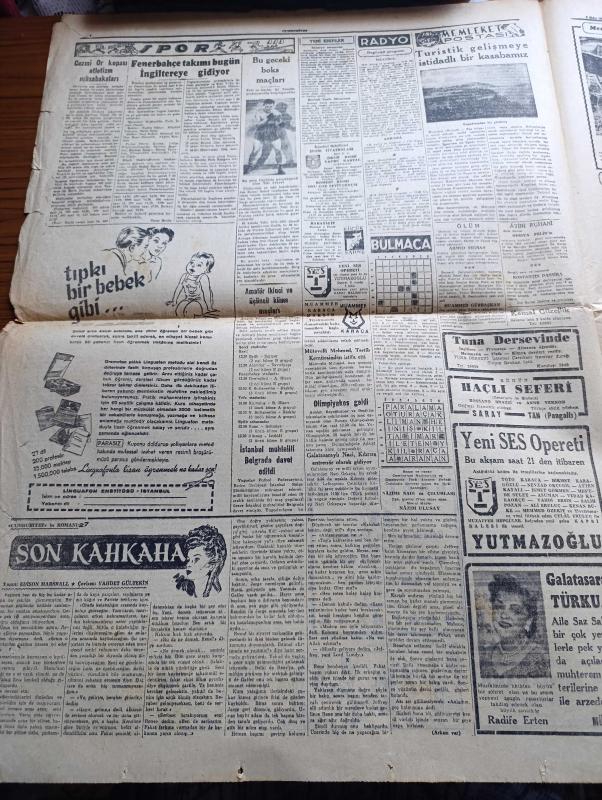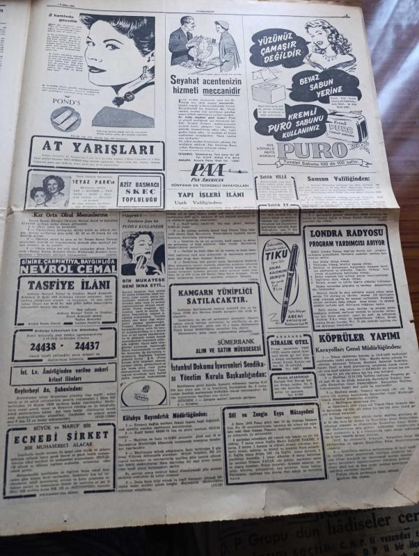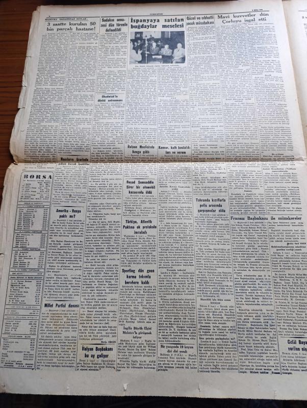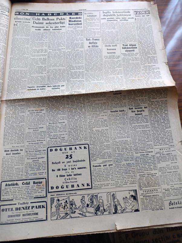 Cumhuriyet Gazetesi - 3 Ekim 1953 - Türk Fransız Dostluğu Ve İttifakı Cumhuriyet Başmakale - Fransız Başbakanı Laniel İle Müzakereler - Cumhurbaşkanı Celal Bayar Fransız Başbakanını Kabul Etti Fotoğraf - Mavi Kuvvetleri Dün Çorluyu İşgal Etti Fotoğraf - Amerika Rusya Paktı Mı - Harika Su Partisi Unvanını Kazanan Florence Chadwick Boğazda Yüzerken Fotoğrafı - Harika Çocuk İdil Biret Fotoğrafı - Necmettin Sadak'ın Cenazesi Dün Törenle Defnedildi Fotoğrafı - Lizbon Cerrahi Kongresi Yazan Ordinaryüs Profesör Doktor Kazım İsmail Gürkan - Beyaz Köşkte Oturanlar Yazan Rikkat Köknar Yazı Dizisi - Kore'deki Tarafsızlar Yazan Ömer Sami Coşar - Esnafın Öğle Tatili Yazan Burhan Felek Köşe Yazısı - Artist Esther Williams'ın Bir Kız Çocuğu Oldu - Fenerbahçe Takımı Bugün İngiltere'ye Gidiyor - İstanbul Ankara Radyosu Programı - Haçlı Seferi Filmi Bugün Saray Ve Tan Sinemasında - Resimli Roman Bolo Paşa Vakası Yazan Pierre Gordeaux - 3 Saatte Kurulan 50 Bin Parçalı Hastane - Steyr Otobüs, Yunus Nadi tarafından kaleme alınmıştır. Cumhuriyet Gazetesi - 3 Ekim 1953 - Türk Fransız Dostluğu Ve İttifakı Cumhuriyet Başmakale - Fransız Başbakanı Laniel İle Müzakereler - Cumhurbaşkanı Celal Bayar Fransız Başbakanını Kabul Etti Fotoğraf - Mavi Kuvvetleri Dün Çorluyu İşgal Etti Fotoğraf - Amerika Rusya Paktı Mı - Harika Su Partisi Unvanını Kazanan Florence Chadwick Boğazda Yüzerken Fotoğrafı - Harika Çocuk İdil Biret Fotoğrafı - Necmettin Sadak'ın Cenazesi Dün Törenle Defnedildi Fotoğrafı - Lizbon Cerrahi Kongresi Yazan Ordinaryüs Profesör Doktor Kazım İsmail Gürkan - Beyaz Köşkte Oturanlar Yazan Rikkat Köknar Yazı Dizisi - Kore'deki Tarafsızlar Yazan Ömer Sami Coşar - Esnafın Öğle Tatili Yazan Burhan Felek Köşe Yazısı - Artist Esther Williams'ın Bir Kız Çocuğu Oldu - Fenerbahçe Takımı Bugün İngiltere'ye Gidiyor - İstanbul Ankara Radyosu Programı - Haçlı Seferi Filmi Bugün Saray Ve Tan Sinemasında - Resimli Roman Bolo Paşa Vakası Yazan Pierre Gordeaux - 3 Saatte Kurulan 50 Bin Parçalı Hastane - Steyr Otobüs adlı eser Türkçe dilindedir.
