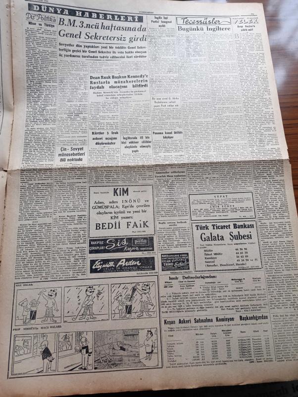 Cumhuriyet Gazetesi - 3 Ekim 1961 - Mısır Elçisine Ankara'yı Terketmesi Bildirildi - Çanakkale Hadisesi İle İlgili Tahkikata Dünkü Gelişmeler - Taşlıtarlanın Eski Demokrat Parti Ocak Başkanı Olan Hüseyin Kansız Örfi İdareye Verildi - Beyrut Elçilik Binasına Bomba Atan Şahıs Hala Yakalanamadı - Partilerin Radyo Konuşmaları - Samsunlu Vatandaş Çengel Hafız Seçim Neticesini Nasıl Görüyor - Çaresaz Yazan Halide Edip Adıvar Yazı Dizisi - Sinema Ve Jandarma Halil Yazan Cevat Fehmi Başkut Köşe Yazısı - Bay Oscar Karikatür - Profesör Nimbüs'ün Maceraları Çizgi Roman - Kürtler 3 Irak Askeri Uçağını Düşürmüşler - Panama Kanal İhtilafı Büyüyor - Yurtta Seçim Mücadelesi İntibaları - Tunceli'de Hiç Bir Parti Barajı Aşamayacak Mı - Resimli Roman Bankerin Milyonları Çizen Yves Sayol - Avrupa Şampiyon Kulüpler Turnuvasında Fenerbahçe'nin Rakibi Nürnberg 30 Ekimi Teklif Etti - Pele Hasta, Yunus Nadi tarafından kaleme alınmıştır. Cumhuriyet Gazetesi - 3 Ekim 1961 - Mısır Elçisine Ankara'yı Terketmesi Bildirildi - Çanakkale Hadisesi İle İlgili Tahkikata Dünkü Gelişmeler - Taşlıtarlanın Eski Demokrat Parti Ocak Başkanı Olan Hüseyin Kansız Örfi İdareye Verildi - Beyrut Elçilik Binasına Bomba Atan Şahıs Hala Yakalanamadı - Partilerin Radyo Konuşmaları - Samsunlu Vatandaş Çengel Hafız Seçim Neticesini Nasıl Görüyor - Çaresaz Yazan Halide Edip Adıvar Yazı Dizisi - Sinema Ve Jandarma Halil Yazan Cevat Fehmi Başkut Köşe Yazısı - Bay Oscar Karikatür - Profesör Nimbüs'ün Maceraları Çizgi Roman - Kürtler 3 Irak Askeri Uçağını Düşürmüşler - Panama Kanal İhtilafı Büyüyor - Yurtta Seçim Mücadelesi İntibaları - Tunceli'de Hiç Bir Parti Barajı Aşamayacak Mı - Resimli Roman Bankerin Milyonları Çizen Yves Sayol - Avrupa Şampiyon Kulüpler Turnuvasında Fenerbahçe'nin Rakibi Nürnberg 30 Ekimi Teklif Etti - Pele Hasta adlı eser Türkçe dilindedir.