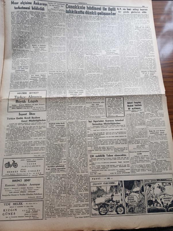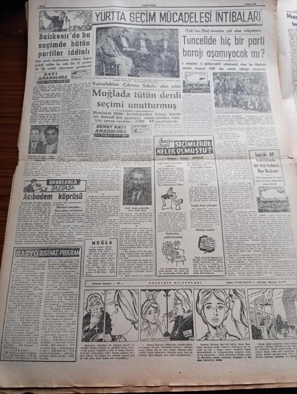 Cumhuriyet Gazetesi - 3 Ekim 1961 - Mısır Elçisine Ankara'yı Terketmesi Bildirildi - Çanakkale Hadisesi İle İlgili Tahkikata Dünkü Gelişmeler - Taşlıtarlanın Eski Demokrat Parti Ocak Başkanı Olan Hüseyin Kansız Örfi İdareye Verildi - Beyrut Elçilik Binasına Bomba Atan Şahıs Hala Yakalanamadı - Partilerin Radyo Konuşmaları - Samsunlu Vatandaş Çengel Hafız Seçim Neticesini Nasıl Görüyor - Çaresaz Yazan Halide Edip Adıvar Yazı Dizisi - Sinema Ve Jandarma Halil Yazan Cevat Fehmi Başkut Köşe Yazısı - Bay Oscar Karikatür - Profesör Nimbüs'ün Maceraları Çizgi Roman - Kürtler 3 Irak Askeri Uçağını Düşürmüşler - Panama Kanal İhtilafı Büyüyor - Yurtta Seçim Mücadelesi İntibaları - Tunceli'de Hiç Bir Parti Barajı Aşamayacak Mı - Resimli Roman Bankerin Milyonları Çizen Yves Sayol - Avrupa Şampiyon Kulüpler Turnuvasında Fenerbahçe'nin Rakibi Nürnberg 30 Ekimi Teklif Etti - Pele Hasta adlı eser, Kitap > Süreli Yayınlar > Gazeteler > Türkiye > Genel > Günlük kategorisinde İkinci El olarak satıştadır.