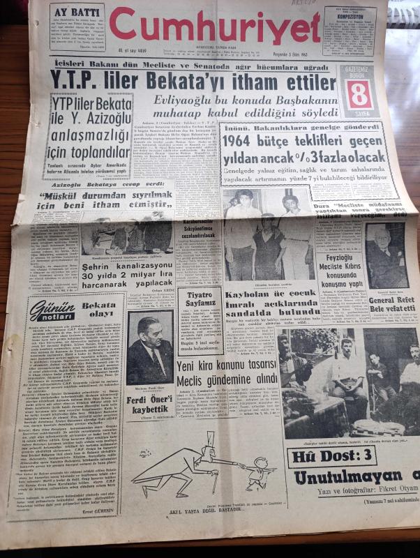 Cumhuriyet Gazetesi - 3 Ekim 1963 - Yeni Türkiye Partililer Hıfzı Oğuz Bekata'yı İtham Ettiler - Sağlık Bakanı Yusuf Azizoğlu Hıfzı Oğuz Bekata'ya Cevap Verdi - Bekata Olayı Yazan Ecvet Güresin - İsmet İnönü Bakanlıklara Genelge Gönderdi - Atatürk'ün En Yakın Silah Arkadaşlarından General Refet Bele Vefat Etti - Hü Dost Yazı Ve Fotoğraflar Fikret Otyam Yazı Dizisi - İlhan Selçuk Köşe Yazısı - Şanlı Kadırgalar Yazan Feridun Fazıl Tülbentçi Yazı Dizisi - Parisli Gözde Çeviren Hatice Vildan Yazı Dizisi - Kennedy Rusya'ya Buğday Satışına Müsaade Edecek - Toto Karaca İle Celal Sururi Zır Delilerde - Esin Eden Dormen Tiyatrosunda - Tülin Oral Abdurrahman Palay Saim Alpago Lale Oraloğlu Ve Ihsan Yüce Dr. Freud Ve Hastası Piyesinde Fotoğraf - Kupe Ve Kabriyole Otomobiller Büyük Rağbet Görüyor - Beşiktaş'ı 3 0 Mağlup Eden Galatasaray Atatürk Kupasında Finale Kaldı - Metin Oktay Dünyaya Gelsem Tekrar Futbolcu Olur Tekrar Galatasaray'da Oynarım - 4. Akdeniz Oyunları Ve Düşünceler - Burhan Felek, Yunus Nadi tarafından kaleme alınmıştır. Cumhuriyet Gazetesi - 3 Ekim 1963 - Yeni Türkiye Partililer Hıfzı Oğuz Bekata'yı İtham Ettiler - Sağlık Bakanı Yusuf Azizoğlu Hıfzı Oğuz Bekata'ya Cevap Verdi - Bekata Olayı Yazan Ecvet Güresin - İsmet İnönü Bakanlıklara Genelge Gönderdi - Atatürk'ün En Yakın Silah Arkadaşlarından General Refet Bele Vefat Etti - Hü Dost Yazı Ve Fotoğraflar Fikret Otyam Yazı Dizisi - İlhan Selçuk Köşe Yazısı - Şanlı Kadırgalar Yazan Feridun Fazıl Tülbentçi Yazı Dizisi - Parisli Gözde Çeviren Hatice Vildan Yazı Dizisi - Kennedy Rusya'ya Buğday Satışına Müsaade Edecek - Toto Karaca İle Celal Sururi Zır Delilerde - Esin Eden Dormen Tiyatrosunda - Tülin Oral Abdurrahman Palay Saim Alpago Lale Oraloğlu Ve Ihsan Yüce Dr. Freud Ve Hastası Piyesinde Fotoğraf - Kupe Ve Kabriyole Otomobiller Büyük Rağbet Görüyor - Beşiktaş'ı 3 0 Mağlup Eden Galatasaray Atatürk Kupasında Finale Kaldı - Metin Oktay Dünyaya Gelsem Tekrar Futbolcu Olur Tekrar Galatasaray'da Oynarım - 4. Akdeniz Oyunları Ve Düşünceler - Burhan Felek adlı eser Türkçe dilindedir.