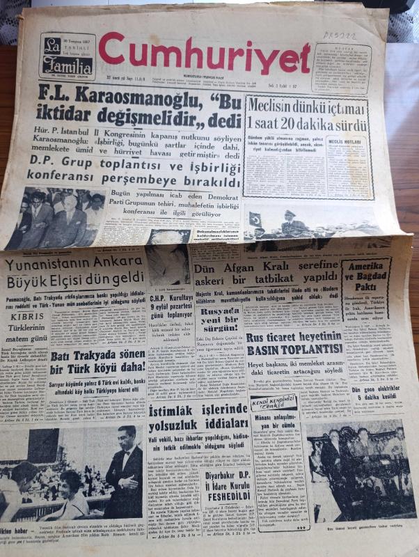 Cumhuriyet Gazetesi - 3 Eylül 1957 - Fevzi Lütfi Karaosmanoğlu Bu İktidar Değişmelidir Dedi - Meclisin Dünkü İçtimai 1 Saat 20 Dakika Sürdü - Yunanistan'ın Ankara Büyükelçisi George Pesmazoğlu Geldi Fotoğraf - Venedik Film Festivali - Dün Afgan Kralı Şerefine Askerî Bir Tatbikat Yapıldı - İstimlak İşlerinde Yolsuzluk İddiaları - Cumhuriyet Venedik Film Festivalinde Röportajı Yapan Selmi Andak - Turist Seyahat Anonim Şirketi Kuruldu - Osmanlı Bankası - Rock And Roll'den Sonra Mahkemeye - Mühürleri Alınan Muhtarlar - Emekli Sandığının Niyetleri Yazan Burhan Felek Köşe Yazısı - Ankara İstanbul Radyosu Programı - Kıbrıs Türklerinin Matem Günü İsmail Beyoğlu'nun Cenazesi - Vefa Ve Beşiktaş Dün Akşam Kampa Girdiler - Dün İstanbul Tenis Şampiyonası Başladı - Karagümrük Beylerbeyi Maçı - Türkiye Romanya Basketbol Maçı Fotoğraf - Piyale Makarna - Selmer Çocuk Bisikletleri, Yunus Nadi tarafından kaleme alınmıştır. Cumhuriyet Gazetesi - 3 Eylül 1957 - Fevzi Lütfi Karaosmanoğlu Bu İktidar Değişmelidir Dedi - Meclisin Dünkü İçtimai 1 Saat 20 Dakika Sürdü - Yunanistan'ın Ankara Büyükelçisi George Pesmazoğlu Geldi Fotoğraf - Venedik Film Festivali - Dün Afgan Kralı Şerefine Askerî Bir Tatbikat Yapıldı - İstimlak İşlerinde Yolsuzluk İddiaları - Cumhuriyet Venedik Film Festivalinde Röportajı Yapan Selmi Andak - Turist Seyahat Anonim Şirketi Kuruldu - Osmanlı Bankası - Rock And Roll'den Sonra Mahkemeye - Mühürleri Alınan Muhtarlar - Emekli Sandığının Niyetleri Yazan Burhan Felek Köşe Yazısı - Ankara İstanbul Radyosu Programı - Kıbrıs Türklerinin Matem Günü İsmail Beyoğlu'nun Cenazesi - Vefa Ve Beşiktaş Dün Akşam Kampa Girdiler - Dün İstanbul Tenis Şampiyonası Başladı - Karagümrük Beylerbeyi Maçı - Türkiye Romanya Basketbol Maçı Fotoğraf - Piyale Makarna - Selmer Çocuk Bisikletleri adlı eser Türkçe dilindedir.