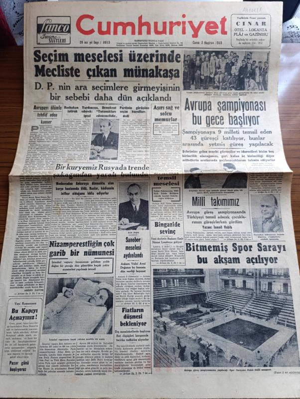 Cumhuriyet Gazetesi - 3 Haziran 1949 - Avrupa'yı ölümle tehdit eden kanser yazan Abidin Daver Başmakale - seçim meselesi üzerine meclise çıkan münakaşa - Demokrat Parti'nin ara seçimlere girmeyişinin bir sebebi daha açıklandı - Avrupa Şampiyonası Bu Gece başlıyor - İstanbul'a gelen ecnebi güreşçilerden bir kısmı tarabya'da tokatlıyan otelinin kapısında fotoğraf - Milli takımımız Yazan İsmail Habib - bitmemiş spor sarayı bu akşam açılıyor fotoğraf - talebe Federasyonu milli Türk Talebe birliği'nin yakında kendini fesh edeceğini bildiriyor - kuryemiz Fuat Güzaltan Rusya'da trende şakağından yaralı bulundu - aşırı sağ ve solcu memurlar - On Yaşında Bir Kumarbaz yazan doktor Kemal Saraçoğlu - Beyoğlu Zükûr Hastanesi bugün açılıyor - kiracılar miting yapacaklar - Türkiye İş Bankası'nın Mardin şubesi açıldı - Beylik kar edemez yazan Burhan Felek - Rangers Takımı Dün İzmir'den Geldi Fotoğraf - Galatasaray dün ankaragücü'ne 4-3 yenildi - Mualla Gökçay ve Sıtkı Akçatepe Yenikapı M. Çakır'da, Yunus Nadi tarafından kaleme alınmıştır. Cumhuriyet Gazetesi - 3 Haziran 1949 - Avrupa'yı ölümle tehdit eden kanser yazan Abidin Daver Başmakale - seçim meselesi üzerine meclise çıkan münakaşa - Demokrat Parti'nin ara seçimlere girmeyişinin bir sebebi daha açıklandı - Avrupa Şampiyonası Bu Gece başlıyor - İstanbul'a gelen ecnebi güreşçilerden bir kısmı tarabya'da tokatlıyan otelinin kapısında fotoğraf - Milli takımımız Yazan İsmail Habib - bitmemiş spor sarayı bu akşam açılıyor fotoğraf - talebe Federasyonu milli Türk Talebe birliği'nin yakında kendini fesh edeceğini bildiriyor - kuryemiz Fuat Güzaltan Rusya'da trende şakağından yaralı bulundu - aşırı sağ ve solcu memurlar - On Yaşında Bir Kumarbaz yazan doktor Kemal Saraçoğlu - Beyoğlu Zükûr Hastanesi bugün açılıyor - kiracılar miting yapacaklar - Türkiye İş Bankası'nın Mardin şubesi açıldı - Beylik kar edemez yazan Burhan Felek - Rangers Takımı Dün İzmir'den Geldi Fotoğraf - Galatasaray dün ankaragücü'ne 4-3 yenildi - Mualla Gökçay ve Sıtkı Akçatepe Yenikapı M. Çakır'da adlı eser Türkçe dilindedir.