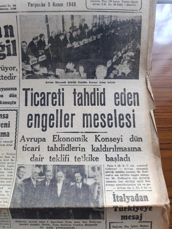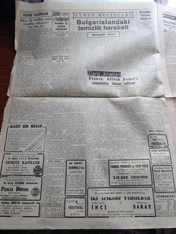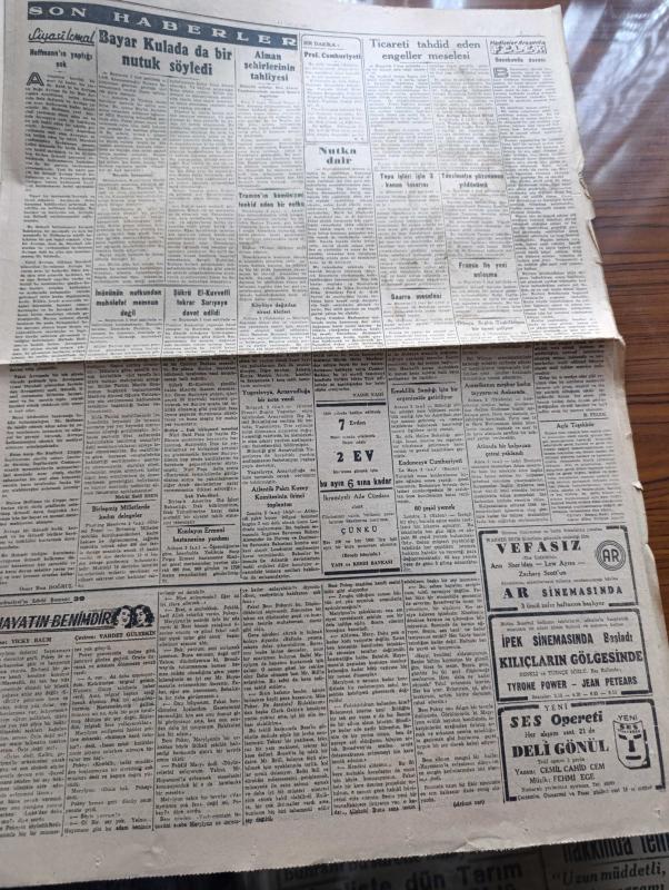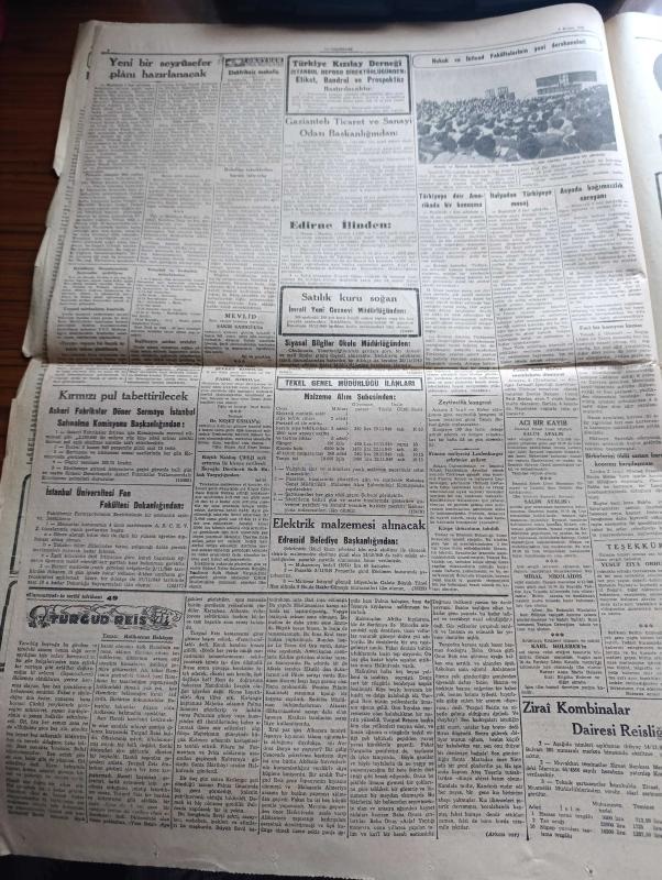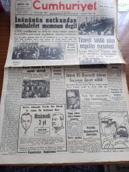 Cumhuriyet Gazetesi - 3 Kasım 1949 - nutka dair yazan Nadir Nadi Başmakale - İsmet İnönü'nün nutkundan muhalefet memnun değil - hükümet azası ve demokrat milletvekilleri İsmet İnönü'yü dinlerken fotoğraf - Celal Bayar Manisa stadyumu'nda bir maçı seyrederken fotoğraf - Fransa Türkiye'ye vereceği tiraj hakkını 2 milyon dolar arttırdı - Avrupa ekonomik işbirliği Teşkilatı Konseyi içtima halinde fotoğraf - Şükrü El Kuvvetli tekrar Suriye'ye davet edildi - yeni bir seyrüsefer planı hazırlanacak - Türkiye'ye dair Amerika'da bir konuşma - Tanzimatın 110. yıldönümü - İstanbul erkek Lisesi müdürü Salim Atalık vefat etti - isimsiz katiller filmi bu akşam Lale sinemasında - Pamuk prenses ve Yedi cüce filmi Yıldız sinemasında - Fransa Alfred Nobel'i casuslukla itham ediyor - Truman'ın komünizmi tenkit eden bir Nutku - Yugoslavya Arnavutluğa bi bir nota verdi - gecekondu davası yazan Burhan Felek - Kızılay'ın Yedikule Surp Pırgıç Ermeni hastanesine yardımı - Turgut Reis yazan Halikarnas balıkçısı adlı eser, Kitap > Süreli Yayınlar > Gazeteler > Türkiye > Genel > Günlük kategorisinde İkinci El olarak satıştadır.