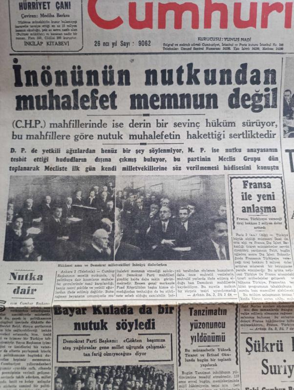 Cumhuriyet Gazetesi - 3 Kasım 1949 - nutka dair yazan Nadir Nadi Başmakale - İsmet İnönü'nün nutkundan muhalefet memnun değil - hükümet azası ve demokrat milletvekilleri İsmet İnönü'yü dinlerken fotoğraf - Celal Bayar Manisa stadyumu'nda bir maçı seyrederken fotoğraf - Fransa Türkiye'ye vereceği tiraj hakkını 2 milyon dolar arttırdı - Avrupa ekonomik işbirliği Teşkilatı Konseyi içtima halinde fotoğraf - Şükrü El Kuvvetli tekrar Suriye'ye davet edildi - yeni bir seyrüsefer planı hazırlanacak - Türkiye'ye dair Amerika'da bir konuşma - Tanzimatın 110. yıldönümü - İstanbul erkek Lisesi müdürü Salim Atalık vefat etti - isimsiz katiller filmi bu akşam Lale sinemasında - Pamuk prenses ve Yedi cüce filmi Yıldız sinemasında - Fransa Alfred Nobel'i casuslukla itham ediyor - Truman'ın komünizmi tenkit eden bir Nutku - Yugoslavya Arnavutluğa bi bir nota verdi - gecekondu davası yazan Burhan Felek - Kızılay'ın Yedikule Surp Pırgıç Ermeni hastanesine yardımı - Turgut Reis yazan Halikarnas balıkçısı, Yunus Nadi tarafından kaleme alınmıştır. Cumhuriyet Gazetesi - 3 Kasım 1949 - nutka dair yazan Nadir Nadi Başmakale - İsmet İnönü'nün nutkundan muhalefet memnun değil - hükümet azası ve demokrat milletvekilleri İsmet İnönü'yü dinlerken fotoğraf - Celal Bayar Manisa stadyumu'nda bir maçı seyrederken fotoğraf - Fransa Türkiye'ye vereceği tiraj hakkını 2 milyon dolar arttırdı - Avrupa ekonomik işbirliği Teşkilatı Konseyi içtima halinde fotoğraf - Şükrü El Kuvvetli tekrar Suriye'ye davet edildi - yeni bir seyrüsefer planı hazırlanacak - Türkiye'ye dair Amerika'da bir konuşma - Tanzimatın 110. yıldönümü - İstanbul erkek Lisesi müdürü Salim Atalık vefat etti - isimsiz katiller filmi bu akşam Lale sinemasında - Pamuk prenses ve Yedi cüce filmi Yıldız sinemasında - Fransa Alfred Nobel'i casuslukla itham ediyor - Truman'ın komünizmi tenkit eden bir Nutku - Yugoslavya Arnavutluğa bi bir nota verdi - gecekondu davası yazan Burhan Felek - Kızılay'ın Yedikule Surp Pırgıç Ermeni hastanesine yardımı - Turgut Reis yazan Halikarnas balıkçısı adlı eser Türkçe dilindedir.