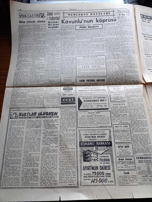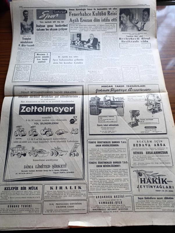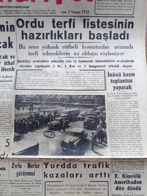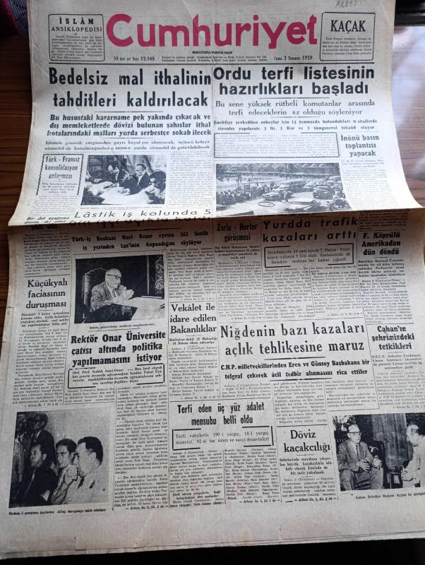 Cumhuriyet Gazetesi - 3 Temmuz 1959 - Bedelsiz Mal İthalinin Tahditleri Kaldırılacak - Ordu Terfi Listesinin Hazırlıkları Başladı - Türk İş Başkanı Nuri Beşer Fotoğrafı - Türk Fransız Konsolidasyon Anlaşması - Bir Jet Uçağımız Düştü İki Pilot Şehit - İstanbul Üniversitesi Rektörü Sıddık Sami Onar Üniversite Çatısı Altında Politika Yapılmamasını İstiyor - İsmet İnönü Basın Toplantısı Yapacak - Fuat Köprülü Amerika'dan Döndü - Niğde'nin Bazı Kazaları Açlık Tehlikesine Maruz - Kavunlu'nun Köprüsü Yazan Fakir Baykurt - Küba'daki İhtilalin İçyüzü Viva Castro Yazı Dizisi - Küba'da Gene İsyan Çıktı - Belçika Prensi İtalyan Prensesi İle Dün Evlendi - Bir Amerikalı Brigitte Bardot'yu Bir Defa Öpmek İçin 10.000 Dolar Teklif Etti - Uluç Ali Yazan Halikarnas Balıkçısı Yazı Dizisi - Hollywood'un En Meşhur Dansörü Fred Astaire Kusurlarını Sayıyor - Aşık Veysel Gecesi Fenerbahçe Kulübü Reisi Agah Erozan Dün İstifa Etti - Tramplen Müsabakasını Utku Altuğ Kazandı - Susurluk Şekerspor Şampiyon Oldu, Yunus Nadi tarafından kaleme alınmıştır. Cumhuriyet Gazetesi - 3 Temmuz 1959 - Bedelsiz Mal İthalinin Tahditleri Kaldırılacak - Ordu Terfi Listesinin Hazırlıkları Başladı - Türk İş Başkanı Nuri Beşer Fotoğrafı - Türk Fransız Konsolidasyon Anlaşması - Bir Jet Uçağımız Düştü İki Pilot Şehit - İstanbul Üniversitesi Rektörü Sıddık Sami Onar Üniversite Çatısı Altında Politika Yapılmamasını İstiyor - İsmet İnönü Basın Toplantısı Yapacak - Fuat Köprülü Amerika'dan Döndü - Niğde'nin Bazı Kazaları Açlık Tehlikesine Maruz - Kavunlu'nun Köprüsü Yazan Fakir Baykurt - Küba'daki İhtilalin İçyüzü Viva Castro Yazı Dizisi - Küba'da Gene İsyan Çıktı - Belçika Prensi İtalyan Prensesi İle Dün Evlendi - Bir Amerikalı Brigitte Bardot'yu Bir Defa Öpmek İçin 10.000 Dolar Teklif Etti - Uluç Ali Yazan Halikarnas Balıkçısı Yazı Dizisi - Hollywood'un En Meşhur Dansörü Fred Astaire Kusurlarını Sayıyor - Aşık Veysel Gecesi Fenerbahçe Kulübü Reisi Agah Erozan Dün İstifa Etti - Tramplen Müsabakasını Utku Altuğ Kazandı - Susurluk Şekerspor Şampiyon Oldu adlı eser Türkçe dilindedir.
