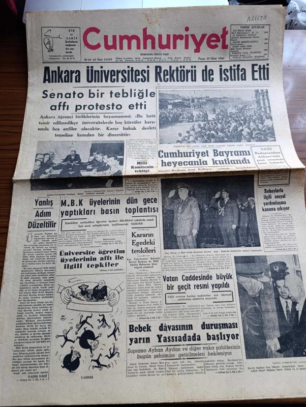 Cumhuriyet Gazetesi - 30 Ekim 1960 - Ankara Üniversitesi Rektörü Suut Kemal Yetkin De İstifa Etti - Yanlış Adım Düzeltilir Yazan Nadir Nadi Köşe Yazısı - Cumhuriyet Bayramı Heyecanla Kutlandı - Milli Birlik Komitesi Üyelerinin Dün Gece Yaptıkları Basın Toplantısı - Vatan Caddesinde Büyük Bir Geçit Resmi Yapıldı - Bebek Davasının Duruşması Yarın Yassıadada Başlıyor - Sabah Şarkısı Yazan Taylor Caldwell Yazı Dizisi - Kuzey Afrika'daki Tehlike Komünizm Değil Cezayir Savaşlarıdır - Başkan Adayı Nixon'a Yumurta Ve Domates Atıldı - Mutlu Akümülatör - Haftanın Şakaları Nikah Çiçeği Yazan Burhan Felek - Profesör Nümbüs'ün Maceraları Çizgi Roman - İstanbul Radyosu Programı - Kıbrıs Türk Kurumları Federasyonu Başkanı Rauf Denktaş İstifa Etti - CENTO Kültür Semineri - Basketbolda Darüşşafaka 56 Modaspor 56 - Beş Klüp Müsabakadan Çekildiler Boks Şampiyonası Yapılmayacak Mı - Galatasaray 3 Karagümrük 0- Yelken Sezonu Dün Kapandı - Profilo Demir Fabrikası - Fenerbahçe 0 Beykoz 0, Yunus Nadi tarafından kaleme alınmıştır. Cumhuriyet Gazetesi - 30 Ekim 1960 - Ankara Üniversitesi Rektörü Suut Kemal Yetkin De İstifa Etti - Yanlış Adım Düzeltilir Yazan Nadir Nadi Köşe Yazısı - Cumhuriyet Bayramı Heyecanla Kutlandı - Milli Birlik Komitesi Üyelerinin Dün Gece Yaptıkları Basın Toplantısı - Vatan Caddesinde Büyük Bir Geçit Resmi Yapıldı - Bebek Davasının Duruşması Yarın Yassıadada Başlıyor - Sabah Şarkısı Yazan Taylor Caldwell Yazı Dizisi - Kuzey Afrika'daki Tehlike Komünizm Değil Cezayir Savaşlarıdır - Başkan Adayı Nixon'a Yumurta Ve Domates Atıldı - Mutlu Akümülatör - Haftanın Şakaları Nikah Çiçeği Yazan Burhan Felek - Profesör Nümbüs'ün Maceraları Çizgi Roman - İstanbul Radyosu Programı - Kıbrıs Türk Kurumları Federasyonu Başkanı Rauf Denktaş İstifa Etti - CENTO Kültür Semineri - Basketbolda Darüşşafaka 56 Modaspor 56 - Beş Klüp Müsabakadan Çekildiler Boks Şampiyonası Yapılmayacak Mı - Galatasaray 3 Karagümrük 0- Yelken Sezonu Dün Kapandı - Profilo Demir Fabrikası - Fenerbahçe 0 Beykoz 0 adlı eser Türkçe dilindedir.
