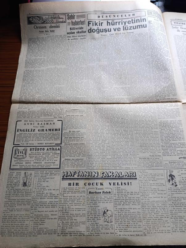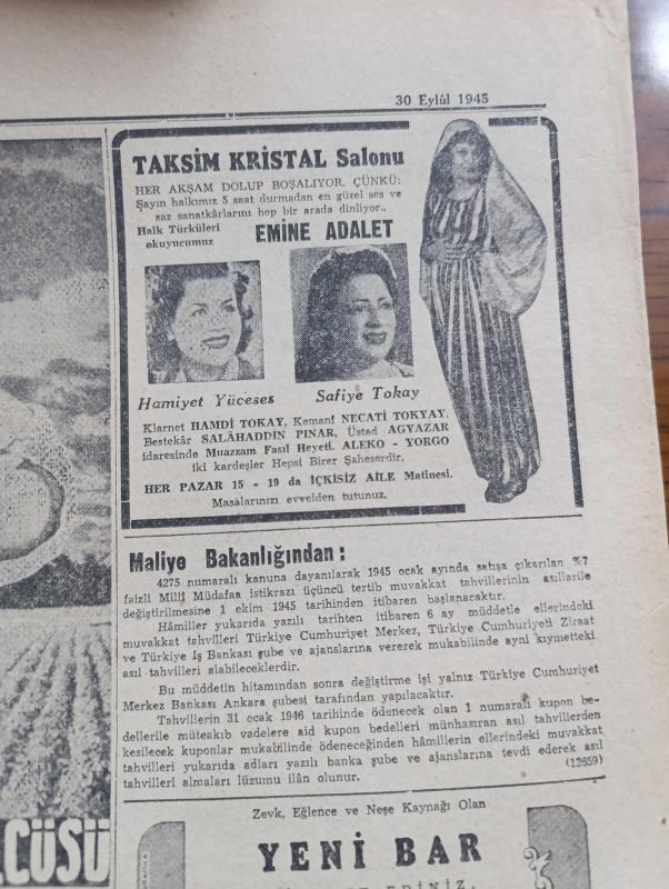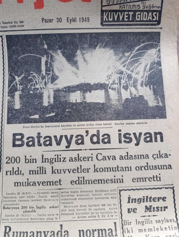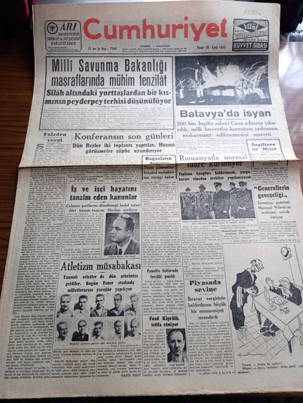 Cumhuriyet Gazetesi - 30 Eylül 1945 - Faizden Vergi Yazan Nadir Nadi Başmakale - Milli Savunma Bakanlığı Masraflarında Mühim Tenzilat - Batavya'da İsyan - Pearl Harbor'da Japonya'nın Kayıtsız Şartsız Teslim Oluşu Haberi Üzerine Yapılan Şehrayin Fotoğraf - Romanya'da Normal İdare Kuruluyor - Atletizm Müsabakası - Bugün Fener Stadında Milletlerarası Yarışlar Yapılıyor - Cemal Nadir Karikatür - Fuat Köprülü İstifa Etmiyor - Haftanın Şakaları Yazan Burhan Felek - Yurtiçinde 2000 Kilometre Yazan Hıfzı Veldet Yazı Dizisi - Şehir Dram Tiyatrosunda İlk Eser Koriolanus Yazan Metin Toker - Hamiyet Yüceses Ve Safiye Tokay Taksim Kristal Salonunda - Safiye Ayla Cağaloğlu Çiftesaraylar Bahçesinde - Bugünkü Radyo Programı - Fazla Şişmanlığa Karşı Radyo Karbon - Zehra Bilir Büyükdere Beyazparkta - Borsa, Yunus Nadi tarafından kaleme alınmıştır. Cumhuriyet Gazetesi - 30 Eylül 1945 - Faizden Vergi Yazan Nadir Nadi Başmakale - Milli Savunma Bakanlığı Masraflarında Mühim Tenzilat - Batavya'da İsyan - Pearl Harbor'da Japonya'nın Kayıtsız Şartsız Teslim Oluşu Haberi Üzerine Yapılan Şehrayin Fotoğraf - Romanya'da Normal İdare Kuruluyor - Atletizm Müsabakası - Bugün Fener Stadında Milletlerarası Yarışlar Yapılıyor - Cemal Nadir Karikatür - Fuat Köprülü İstifa Etmiyor - Haftanın Şakaları Yazan Burhan Felek - Yurtiçinde 2000 Kilometre Yazan Hıfzı Veldet Yazı Dizisi - Şehir Dram Tiyatrosunda İlk Eser Koriolanus Yazan Metin Toker - Hamiyet Yüceses Ve Safiye Tokay Taksim Kristal Salonunda - Safiye Ayla Cağaloğlu Çiftesaraylar Bahçesinde - Bugünkü Radyo Programı - Fazla Şişmanlığa Karşı Radyo Karbon - Zehra Bilir Büyükdere Beyazparkta - Borsa adlı eser Türkçe dilindedir.